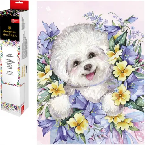 Алмазная мозаика Болонка в цветах, 30х40, без подрамника