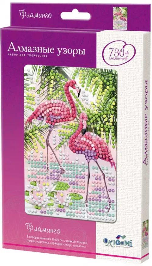 Приглашаем Вас совершить блестящее путешествие в мир алмазной мозаики. Сделать картинку "Фламинго" очень просто. Необходимо снять защитный слой с клеевой основы, и с помощью карандаша - стилуса приклеить стразы по номеру и цвету. Готовую картинку можно поставить на мольберт, который входит в набор.