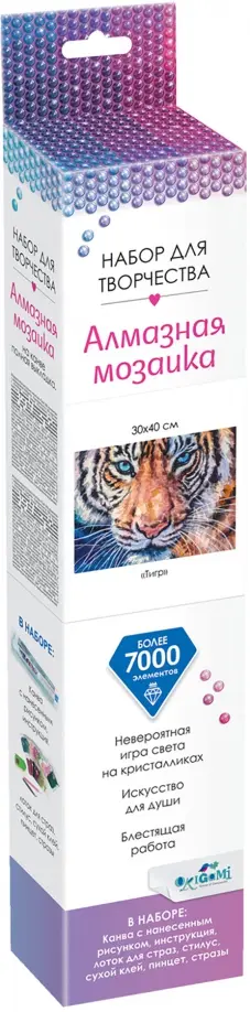 Алмазные картины на канве - это тренд рынка товаров для творчества! И мы создали для вас шикарную коллекцию алмазных мозаик, покоряющую сердца. Самые востребованные дизайны, подтвержденные анализом рынка, придутся по вкусу даже притязательным ценителям блестящих картин для дома. Качественные материалы и модернизированные инструменты для работы позволят в полной мере насладиться творческим процессом. Наша новая алмазная мозаика на канве "Тигр" в размере 30х40 см понравится и детям, и взрослым! Наслаждайтесь творчеством вместе с нами!