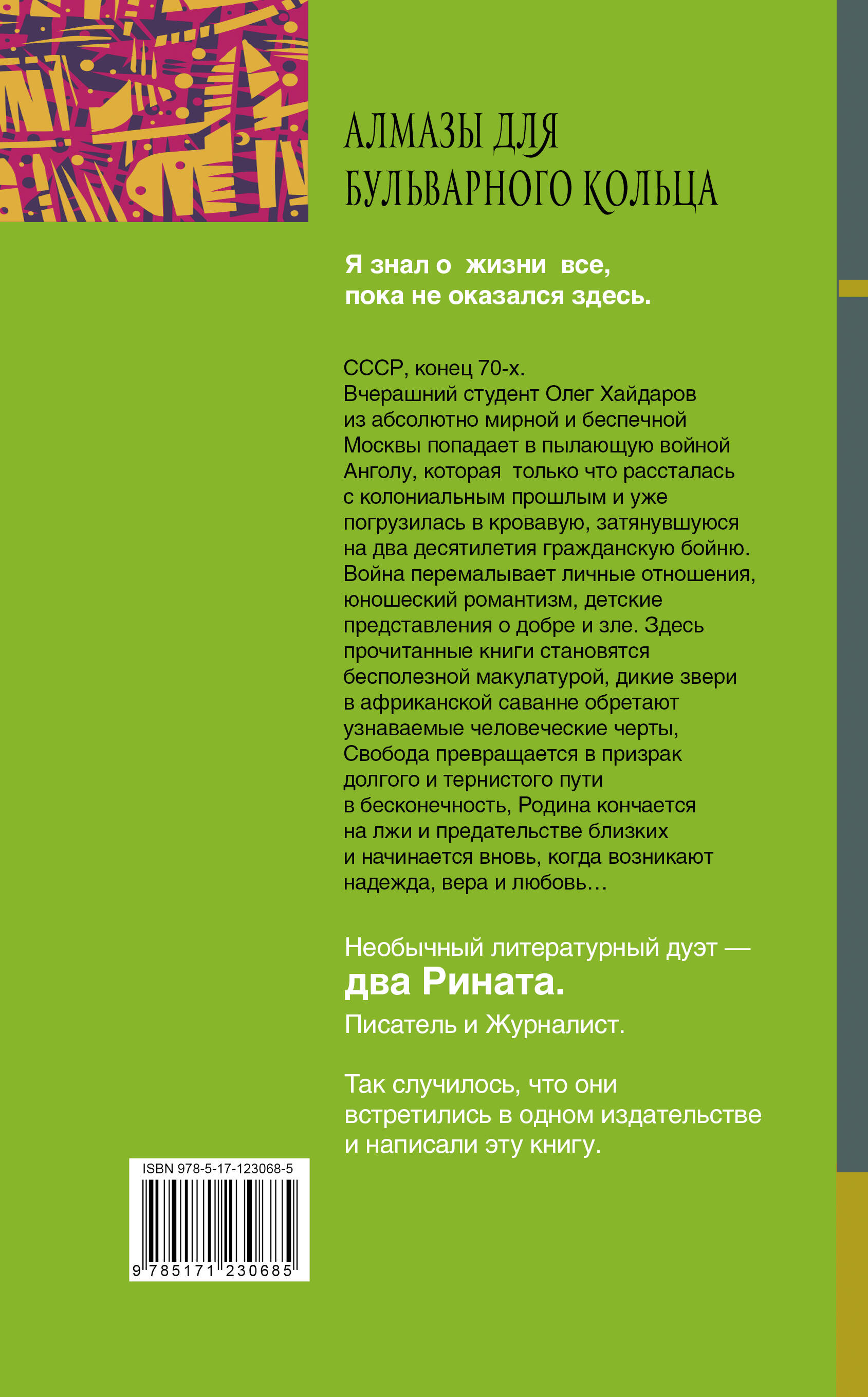 СССР, конец 70-х. Вчерашний студент Олег Хайдаров из абсолютно мирной и беспечной Москвы попадает в пылающую войной Анголу, которая только что рассталась с колониальным прошлым и уже погрузилась в кровавую, затянувшуюся на два десятилетия гражданскую бойню. Война перемалывает личные отношения, юношеский романтизм, детские представления о добре и зле. Здесь прочитанные книги становятся бесполезной макулатурой, дикие звери в африканской саванне обретают узнаваемые человеческие черты, Свобода превращается в призрак долгого и тернистого пути в бесконечность, Родина кончается на лжи и предательстве близких и начинается вновь, когда возникают надежда, вера и любовь…| Издательство | ИЗДАТЕЛЬСТВО "АСТ" |