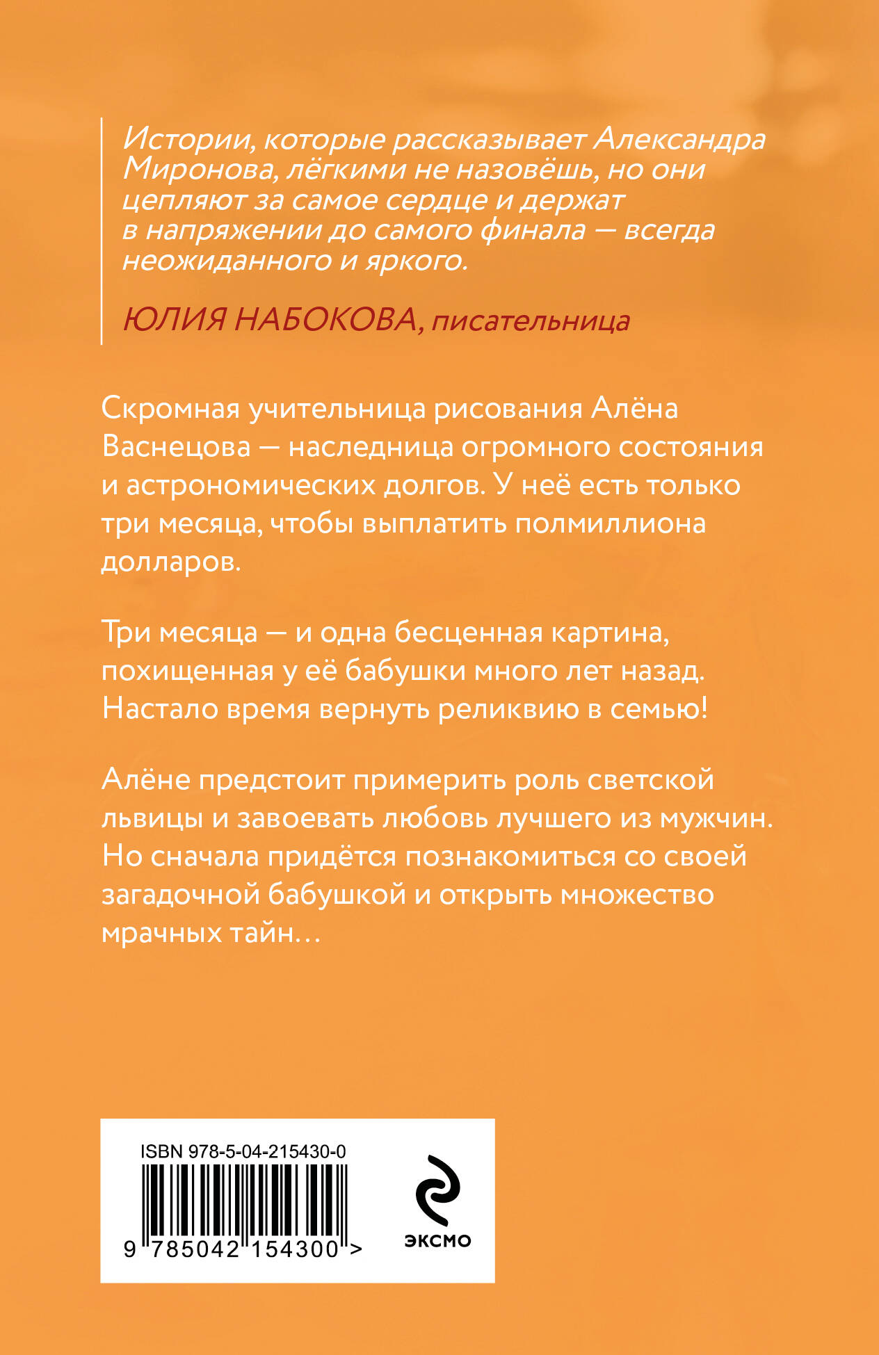 Переиздание талантливого российского автора Александры Мироновой! Скромная учительница рисования Алена Васнецова - наследница огромного состояния и астрономических долгов. У нее есть только три месяца, чтобы выплатить полмиллиона долларов. Три месяца - и одна бесценная картина, похищенная у ее бабушки много лет назад. Настало время вернуть реликвию в семью! Алене предстоит примерить роль светской львицы и завоевать любовь лучшего из мужчин. Но сначала придется познакомиться со своей загадочной бабушкой и открыть множество мрачных тайн…