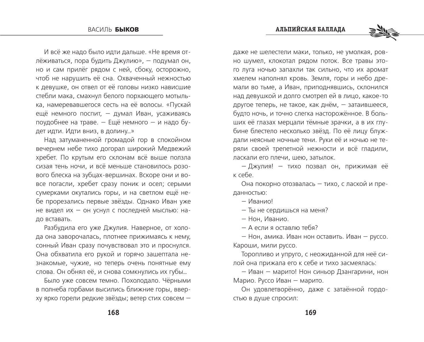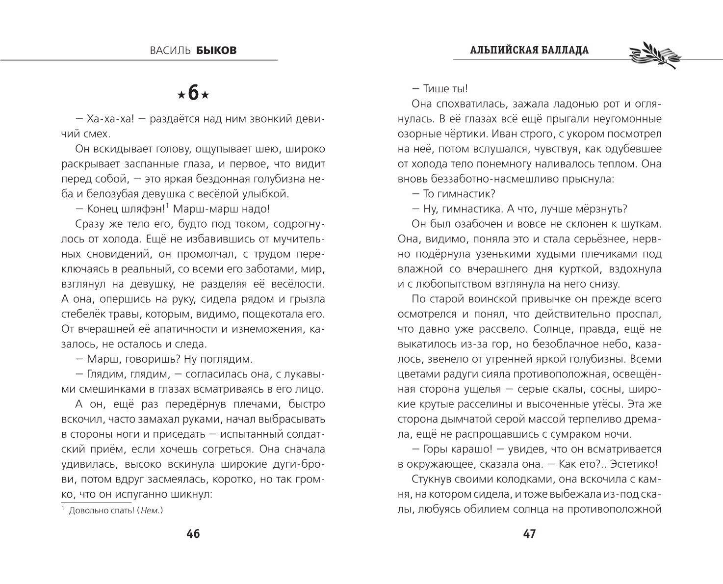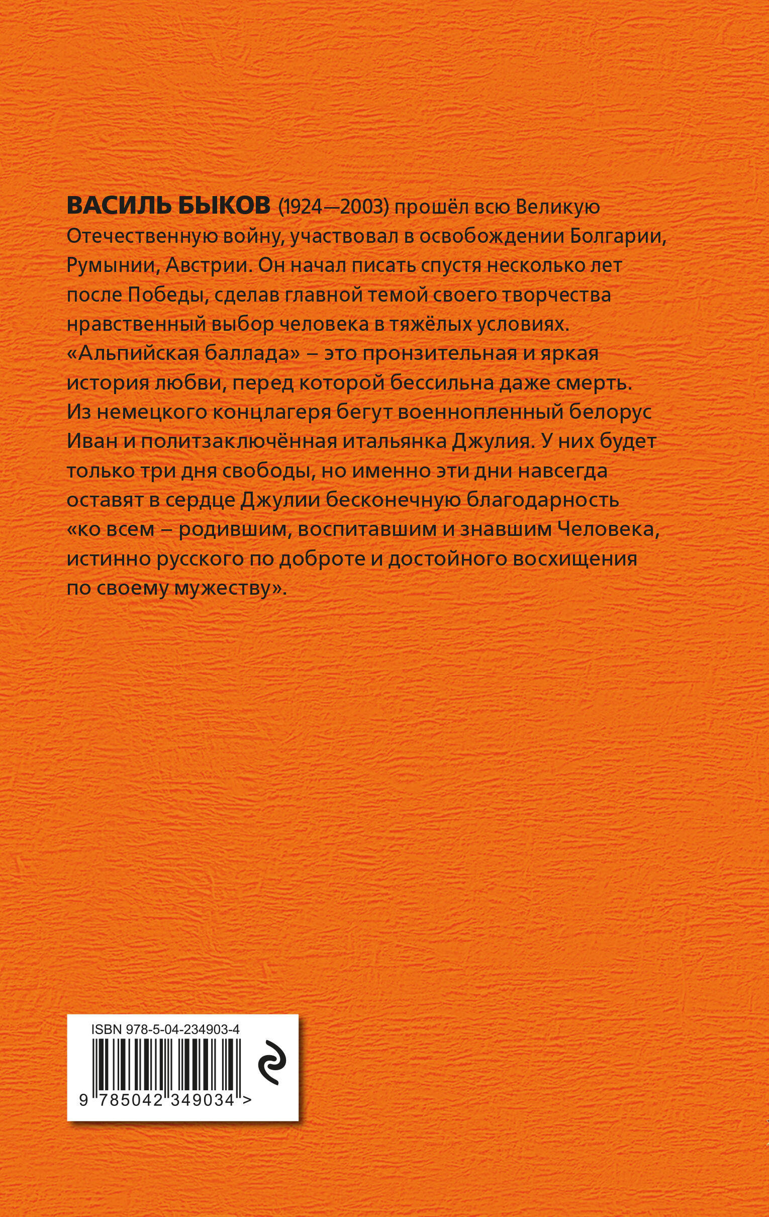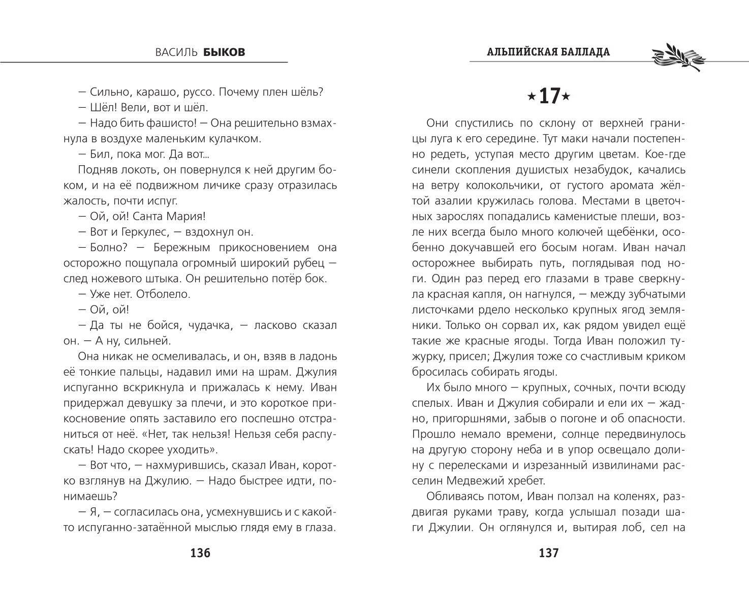 К ЮБИЛЕЮ ВЕЛИКОЙ ПОБЕДЫ! Книга в твёрдом переплёте с частичным лаком. В оформлении серии использованы архивные фотографии военных корреспондентов 1941-1945 гг. Белая бумага. Чёткий, удобный для чтения шрифт. Повесть Василя Быкова «Альпийская баллада» - это трагическая и прекрасная история любви двух обречённых людей. Из немецкого концлагеря убегают русский военнопленный Иван и итальянка Джулия. Спасаясь от погони, они проведут в горах три дня. Тяжелейшие испытания, выпавшие им, помогут героям проявить высокие примеры гуманизма и самоотверженности, а зародившееся чувство навсегда останется самым ярким событием в жизни. По книге снят полнометражный кинофильм.| Издательство | ООО "Издательство "Эксмо" |