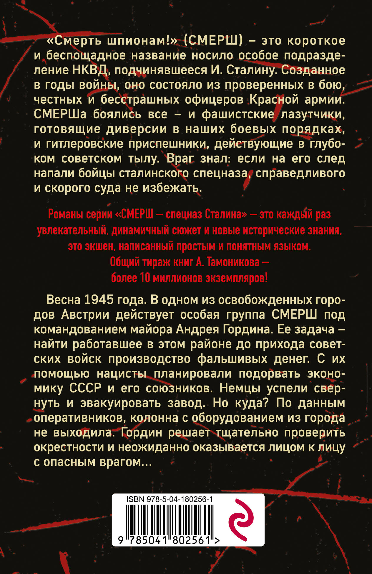 «Смерть шпионам!» (СМЕРШ) - это короткое и беспощадное название носило особое подразделение НКВД, подчинявшееся И. Сталину. Созданное в годы войны, оно состояло из проверенных в бою, честных и бесстрашных офицеров Красной Армии. СМЕРШа боялись все - и фашистские лазутчики, готовящие диверсии в наших боевых порядках, и гитлеровские приспешники, действующие в глубоком советском тылу. Враг знал: если на его след напали бойцы сталинского спецназа, справедливого и скорого суда не избежать. Романы серии «СМЕРШ - спецназ Сталина» - это каждый раз увлекательный динамичный сюжет и новые исторические знания, это экшен, написанный простым и понятным языком. Общий тираж книг А. Тамоникова - более 10 миллионов экземпляров! Весна 1945 года. В одном из освобожденных городов Австрии действует особая группа СМЕРШа под командованием майора Андрея Гордина. Ее задача: найти работавшее в этом районе до прихода советских войск производство фальшивых денег. С их помощью нацисты планировали подорвать экономику СССР и его союзников. Немцы успели свернуть и эвакуировать завод. Но куда? По данным оперативников, колонна с оборудованием из города не выходила. Гордин решает тщательно проверить окрестности и неожиданно оказывается лицом к лицу с опасным врагом…| Издательство | ООО "Издательство "Эксмо" |