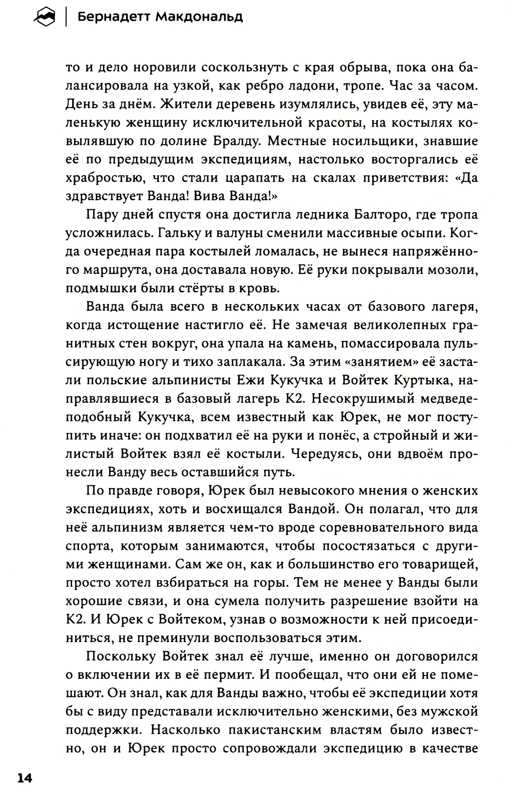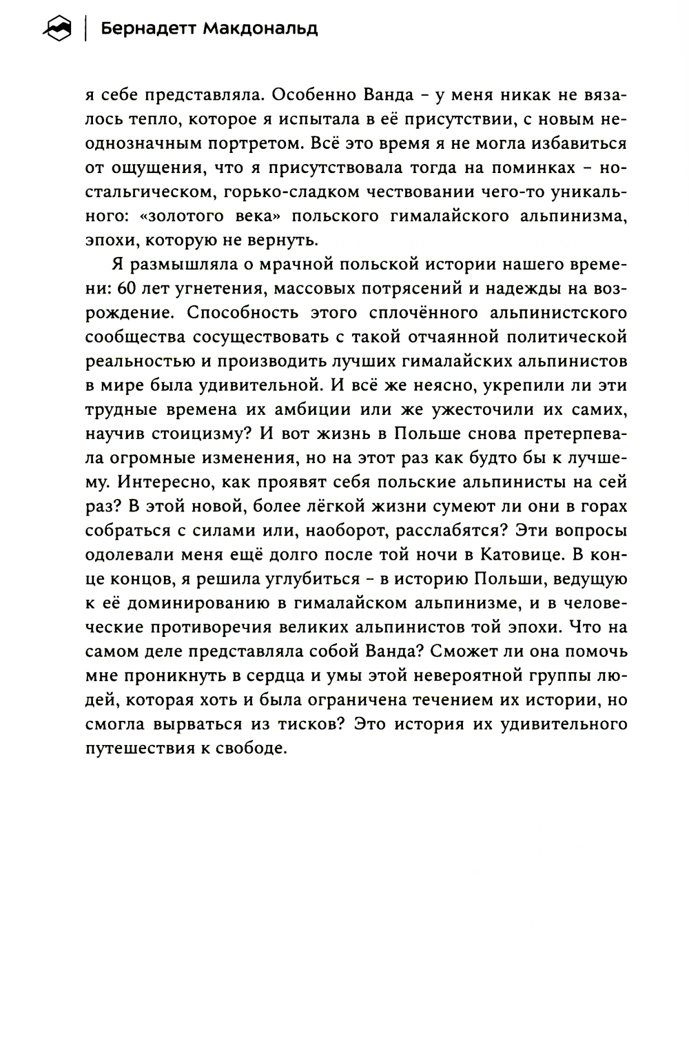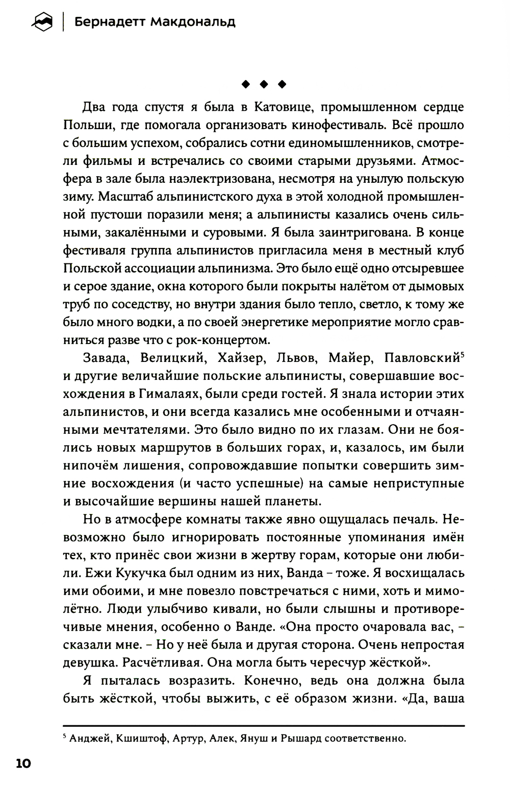 История группы выдающихся польских альпинистов глубоко тронула сердца команды «Спорт-Марафон». Благодаря писательскому дару Бернадетт Макдональд мы можем в любой момент заглянуть в прошлое и узнать, какой ценой обошёлся его героям «золотой век» польского альпинизма. Кто первым взойдёт на все восьмитысячники планеты за год? Что для этого нужно? Сегодня мы знаем ответы лишь на некоторые из вопросов, которые польские альпинисты задавали уже сорок лет назад. Прожив каждую страницу истории этих удивительных людей, мы увидели, как их надежды и мечты нашли отражение в событиях современности. Поэтому мы решили перевести и издать эту книгу на русском языке.| Издательство | Библиотека Спорт-Марафон |