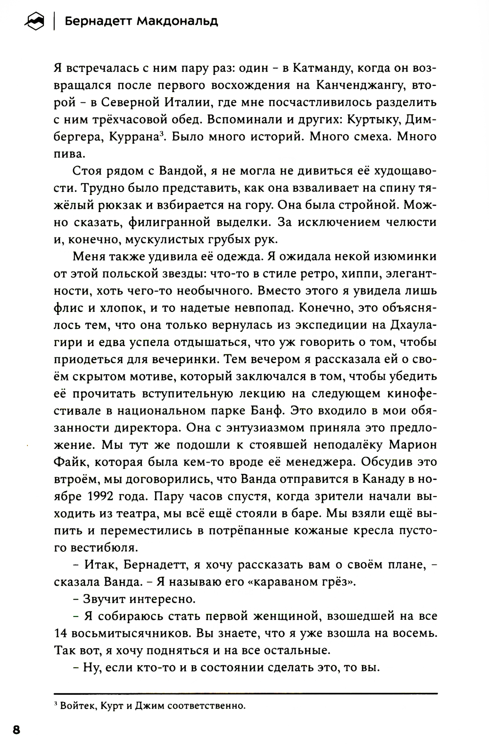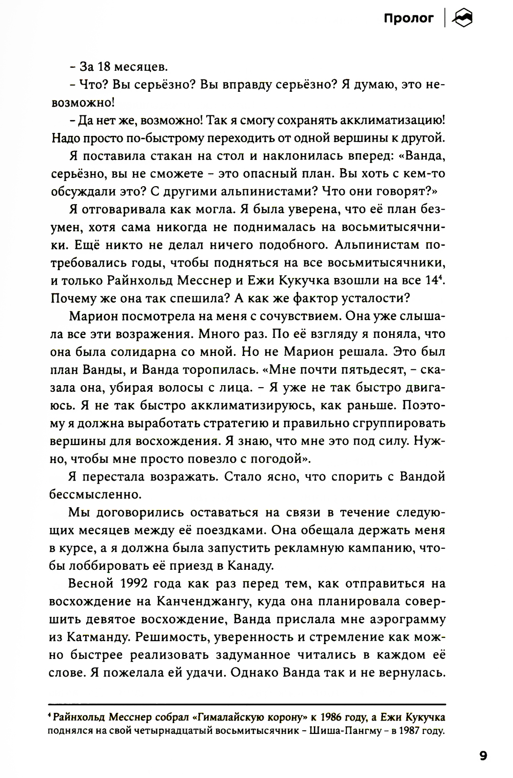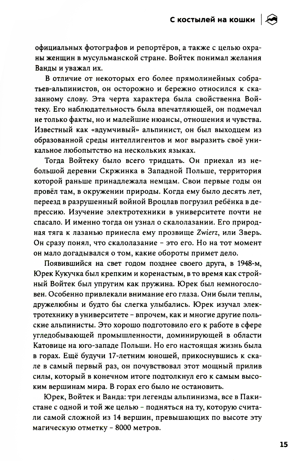 История группы выдающихся польских альпинистов глубоко тронула сердца команды «Спорт-Марафон». Благодаря писательскому дару Бернадетт Макдональд мы можем в любой момент заглянуть в прошлое и узнать, какой ценой обошёлся его героям «золотой век» польского альпинизма. Кто первым взойдёт на все восьмитысячники планеты за год? Что для этого нужно? Сегодня мы знаем ответы лишь на некоторые из вопросов, которые польские альпинисты задавали уже сорок лет назад. Прожив каждую страницу истории этих удивительных людей, мы увидели, как их надежды и мечты нашли отражение в событиях современности. Поэтому мы решили перевести и издать эту книгу на русском языке.| Издательство | Библиотека Спорт-Марафон |