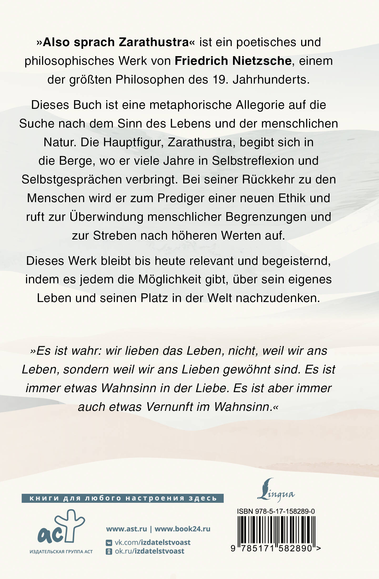 Издание на немецком языке. Книга "Так говорил Заратустра" Фридриха Ницше, одного из величайших философов XIX века, - это уникальное произведение, которое является вершиной его творческой мысли, квинтэссенцией его философских и литературных идей. Ницше представляет древнеперсидского пророка Заратустру как философского проповедника, призывающего освободиться от конформизма и догматизма, исследовать глубины своей души и обрести свой собственный путь к саморазвитию и самосовершенствованию. Это произведение остается актуальным и вдохновляющим и по сей день, предостерегая нас от апатии и пробуждая к размышлениям о своей собственной судьбе и своем месте в мире. Книга издана в неадаптированной версии. Наслаждайтесь философским миром великого мыслителя Ницше в оригинале!| Издательство | ИЗДАТЕЛЬСТВО "АСТ" |