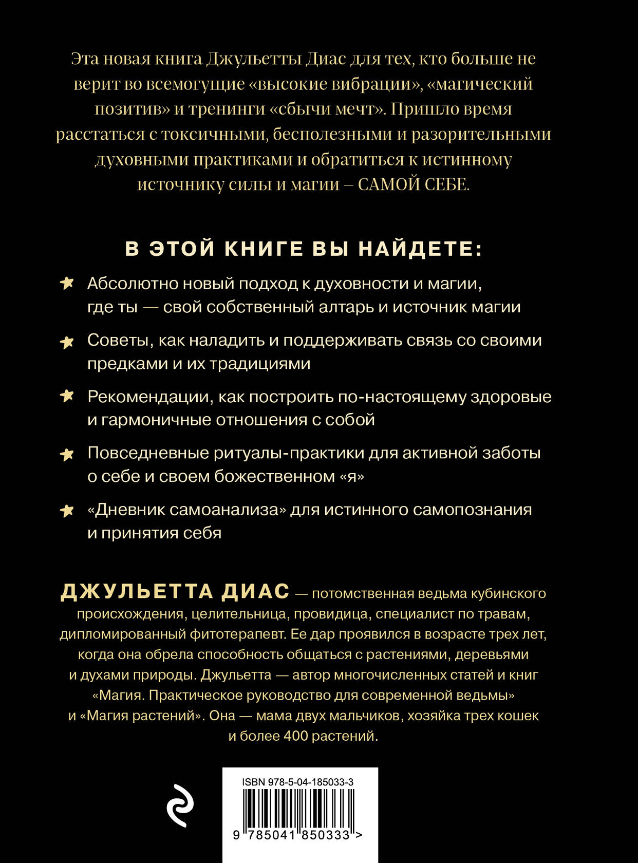 Новая книга Джульетты Диас - абсолютно новый подход к духовности и магии. Она для тех, кто больше не верит во всемогущие «высокие вибрации», «магический позитив» и тренинги «сбычи мечт». Пришло время расстаться с токсичными, бесполезными и разорительными духовными практиками и обратиться к истинному источнику силы и магии - САМОЙ СЕБЕ. В этой книге вы найдете: • Абсолютно новый подход к духовности и магии, где ты - свой собственный алтарь и источник магии. • Советы, как наладить и поддерживать связь со своими предками и их традициями. • Рекомендации, как построить по-настоящему здоровые и гармоничные отношения с собой. • Повседневные ритуалы-практики для активной заботы о себе и своем Божественном «Я». • «Дневник самоанализа» для истинного самопознания и принятия себя. Джульетта Диас - потомственная ведьма кубинского происхождения, целительница, провидица, специалист по травам, дипломированный фитотерапевт. Ее дар проявился в возрасте трех лет, когда она обрела общаться с растениями, деревьями и духами природы. Джульетта - автор многочисленных статей и книг «Магия. Практическое руководство для современной ведьмы» и «Магия растений». Она - мама двух мальчиков, хозяйка трех кошек и более 400 растений.| Издательство | ООО "Издательство "Эксмо" |