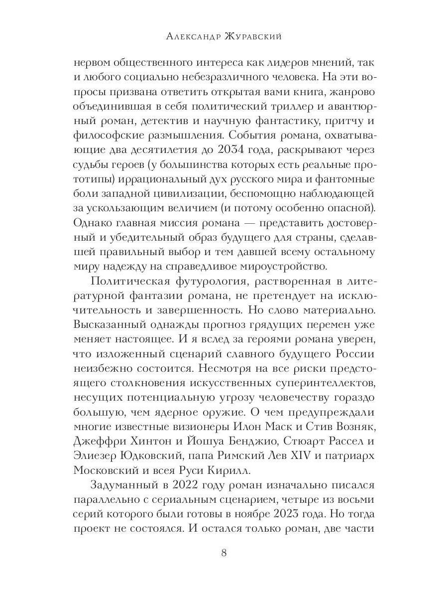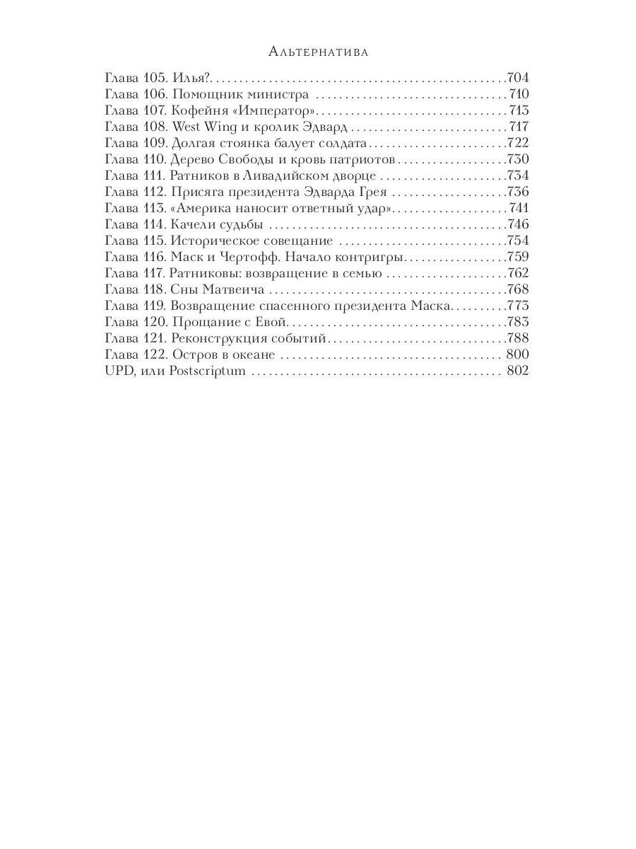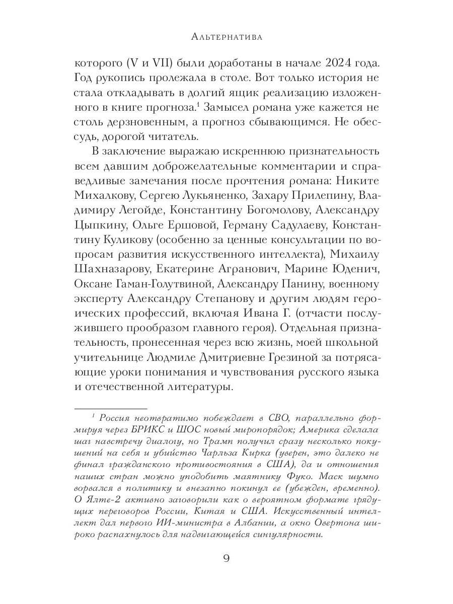 2034 год. То, о чем мы мечтали, стало реальностью. То, чего они боялись, сбылось. Мир в преддверии второй Ялтинской конференции. Тайная операция «Ангелы Апокалипсиса» против России и президента США Илона Маска обернулась битвой разведок, элит и двух искусственных суперинтеллектов. Предотвратить глобальную катастрофу предстоит команде майора Ратникова. Футурологический роман «Альтернатива» - синтез политического триллера и детектива, утопии и фантастики. Вселенная героев поразительной достоверности. Образ будущего без слепых пятен. Остросюжетная книга с непредсказуемым финалом, эмоциональной романтической линией, ироничными диалогами. Роман-пророчество.| Издательство | Рипол Классик |