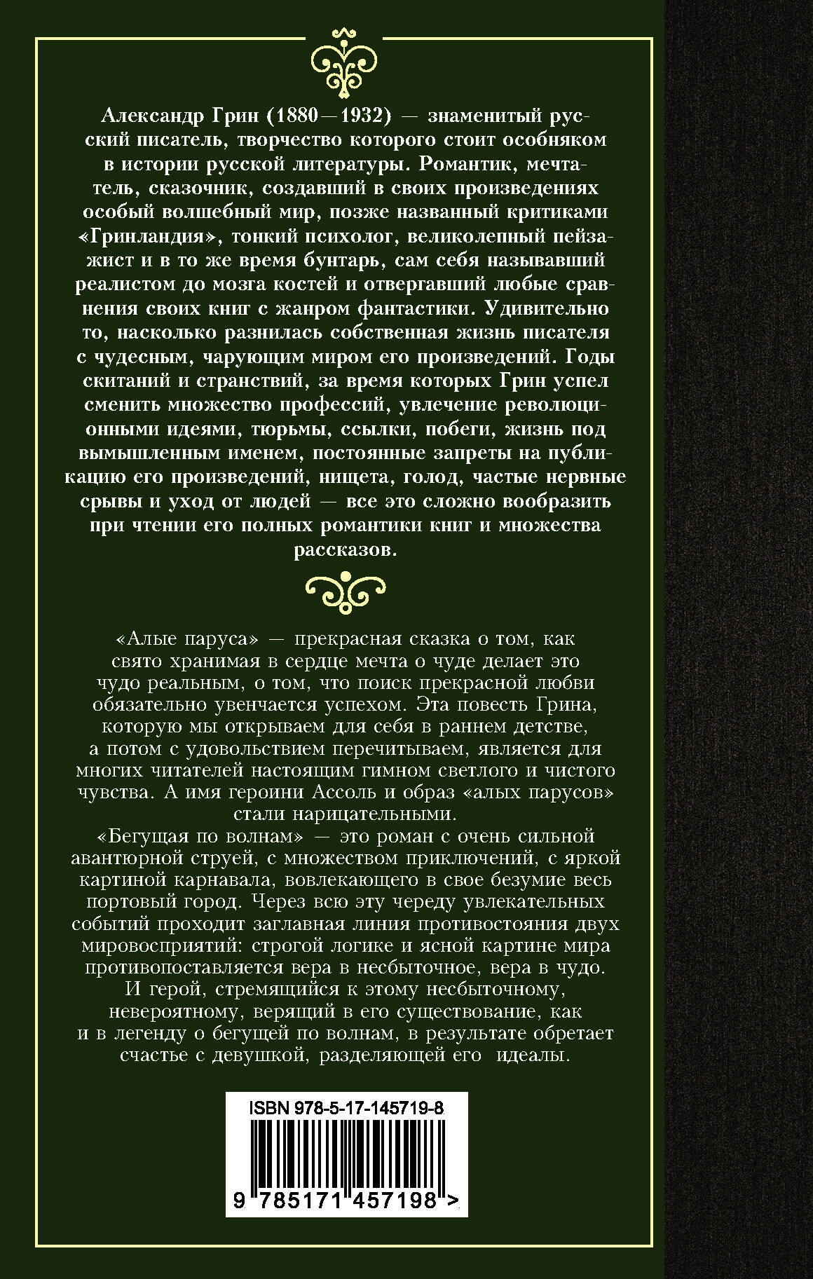 "Алые паруса" - прекрасная сказка о том, как свято хранимая в сердце мечта о чуде делает это чудо реальным, о том, что поиск прекрасной любви обязательно увенчается успехом. Эта повесть Грина, которую мы открываем для себя в раннем детстве, а потом с удовольствием перечитываем, является для многих читателей настоящим гимном светлого и чистого чувства. А имя героини Ассоль и образ "алых парусов" стали нарицательными. "Бегущая по волнам" - это роман с очень сильной авантюрной струей, с множеством приключений, с яркой картиной карнавала, вовлекающего в свое безумие весь портовый город. Через всю эту череду увлекательных событий проходит заглавная линия противостояния двух мировосприятий: строгой логике и ясной картине мира противопоставляется вера в несбыточное, вера в чудо. И герой, стремящийся к этому несбыточному, невероятному, верящий в его существование, как и в легенду о бегущей по волнам, в результате обретает счастье с девушкой, разделяющей его идеалы.| Издательство | АСТ |