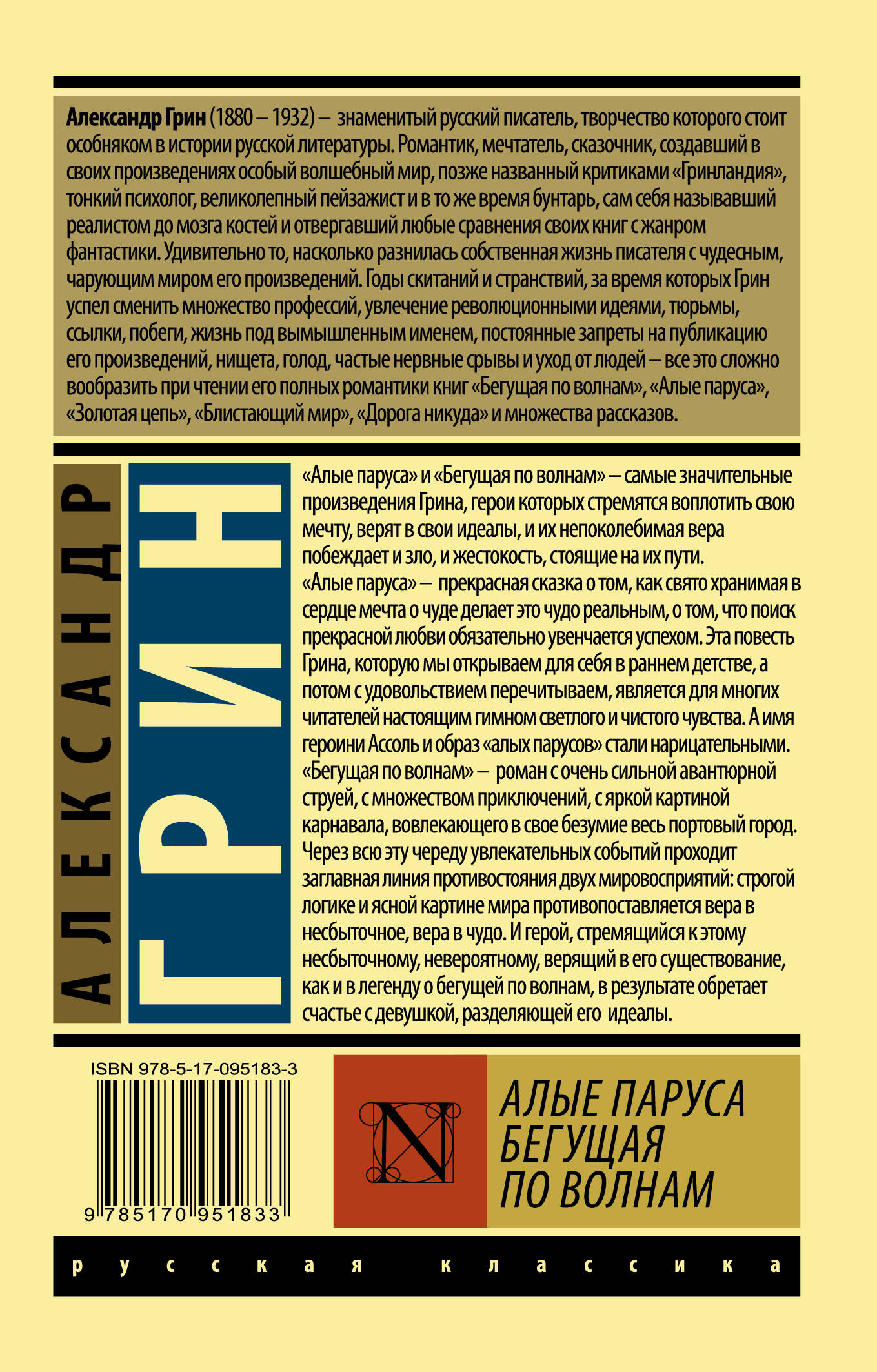 "Алые паруса" и "Бегущая по волнам" - самые значительные произведения Грина, где герои стремятся воплотить свою мечту, верят в свои идеалы, и их непоколебимая вера побеждает и зло и жестокость, стоящие на их пути. "Алые паруса" - прекрасная сказка о том, как свято хранимая в сердце мечта о чуде делает это чудо реальным, о том, что поиск прекрасной любви обязательно увенчается успехом. Эта повесть Грина, которую мы открываем для себя в раннем детстве, а потом с удовольствием перечитываем, является для многих читателей настоящим гимном светлого и чистого чувства. А имя героини Ассоль и образ "алых парусов" стали нарицательными. "Бегущая по волнам" - это роман с очень сильной авантюрной струей, с множеством приключений, с яркой картиной карнавала, вовлекающем в свое безумие весь портовый город. Через всю эту череду увлекательных событий проходит заглавная линия противостояния двух мировосприятий: строгой логике и ясной картине мира противопоставляется вера в несбыточное, вера в чудо. И герой, стремящийся к этому несбыточному, невероятному, верящий в его существование, как и в легенду о бегущей по волнам, в результате обретает счастье с девушкой, разделяющей его идеалы.