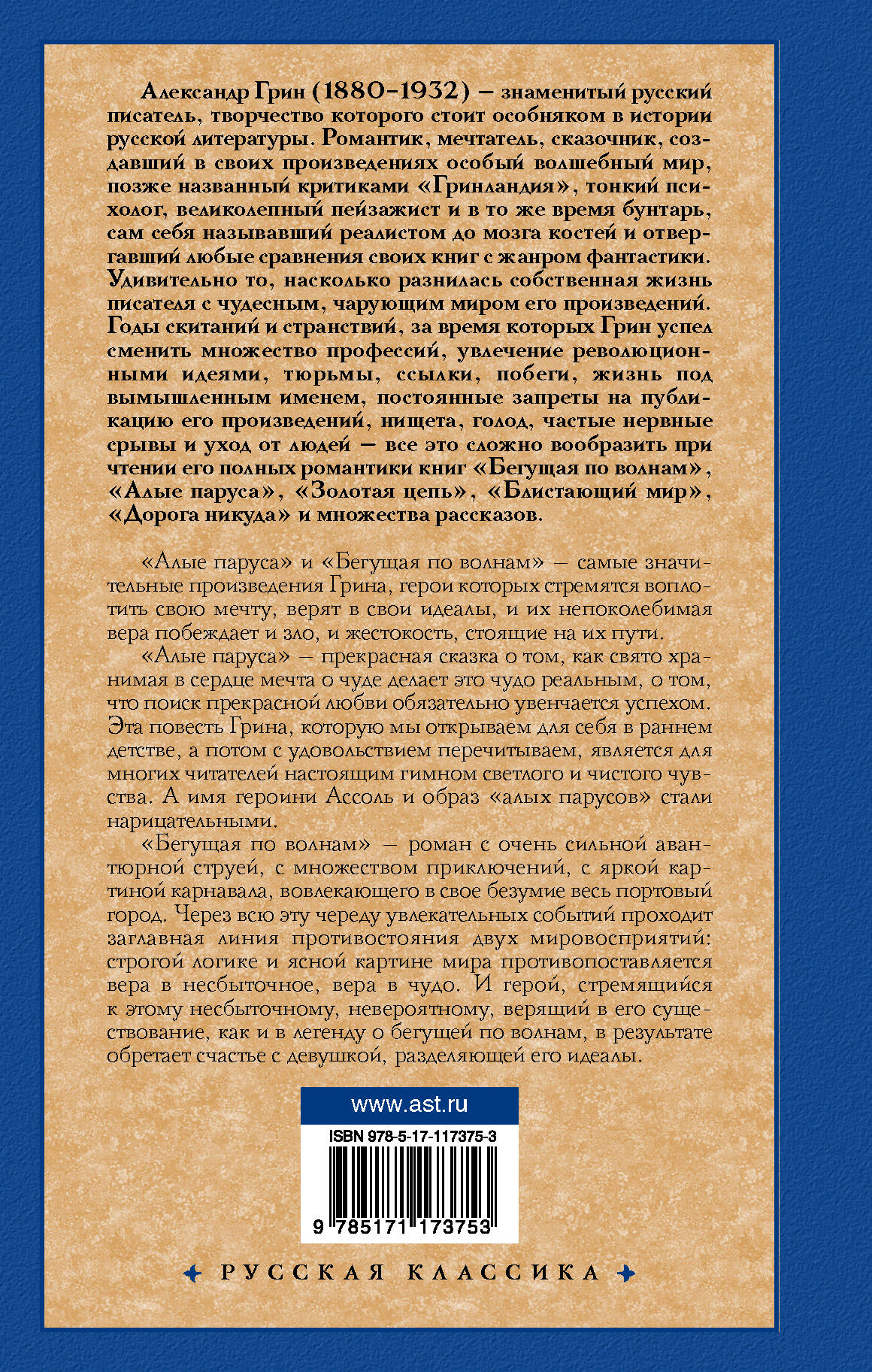 "Алые паруса" и "Бегущая по волнам" - самые значительные произведения Грина, герои которых стремятся воплотить свою мечту, верят в свои идеалы, и их непоколебимая вера побеждает и зло, и жестокость, стоящие на их пути. "Алые паруса" - прекрасная сказка о том, как свято хранимая в сердце мечта о чуде делает это чудо реальным, о том, что поиск прекрасной любви обязательно увенчается успехом. Эта повесть Грина, которую мы открываем для себя в раннем детстве, а потом с удовольствием перечитываем, является для многих читателей настоящим гимном светлого и чистого чувства. А имя героини Ассоль и образ "алых парусов" стали нарицательными. "Бегущая по волнам" - это роман с очень сильной авантюрной струей, с множеством приключений, с яркой картиной карнавала, вовлекающего в свое безумие весь портовый город. Через всю эту череду увлекательных событий проходит заглавная линия противостояния двух мировосприятий: строгой логике и ясной картине мира противопоставляется вера в несбыточное, вера в чудо. И герой, стремящийся к этому несбыточному, невероятному, верящий в его существование, как и в легенду о бегущей по волнам, в результате обретает счастье с девушкой, разделяющей его идеалы.| Издательство | ИЗДАТЕЛЬСТВО "АСТ" |