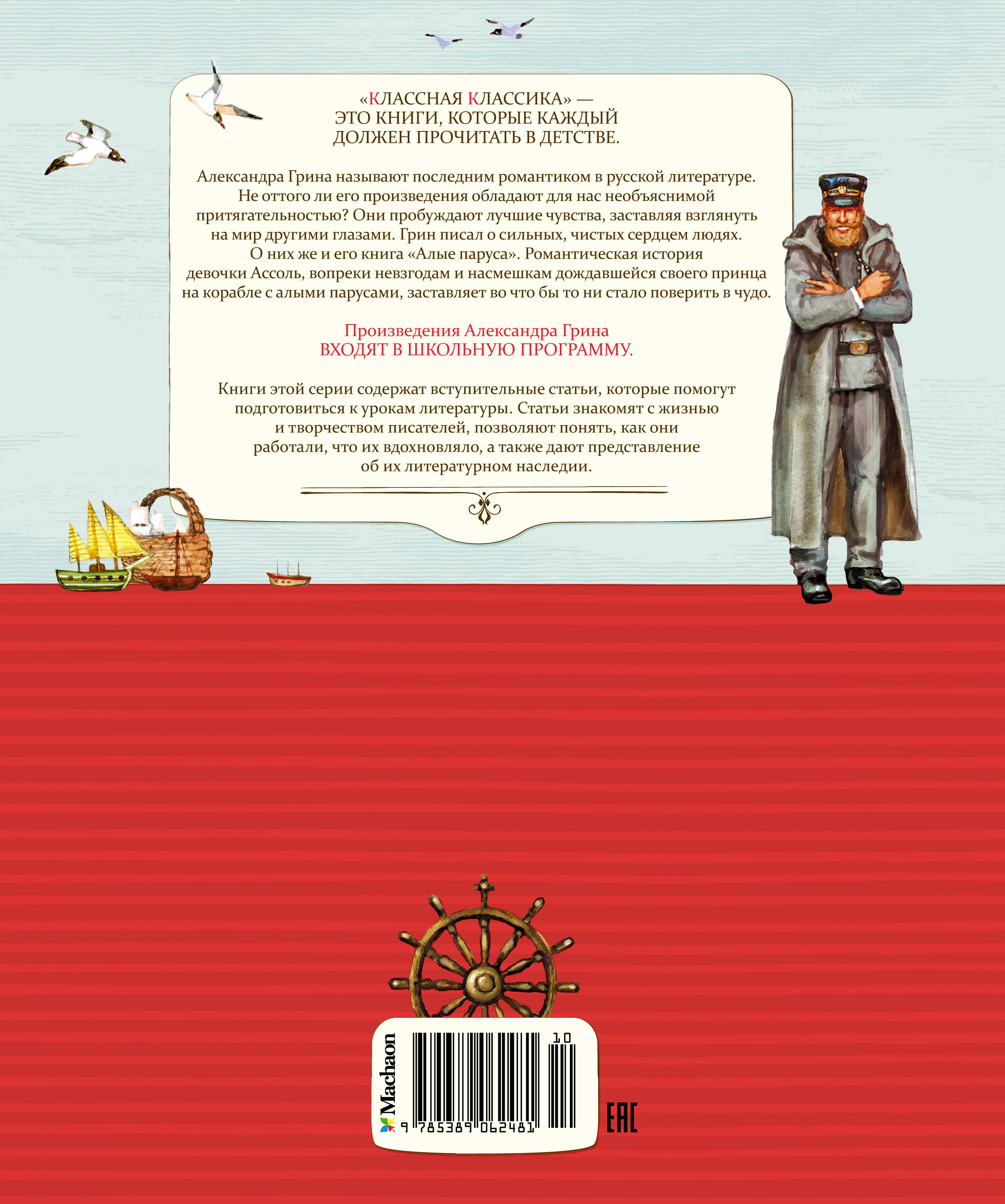 Александра Грина называют последним романтиком в русской литературе. Не оттого ли его произведения обладают для нас необъяснимой притягательностью. Они пробуждают лучшие чувства, заставляя взглянуть на мир другими глазами. Грин писал о сильных, чистых сердцем людях. О них же и его книга "Алые паруса". Романтическая история девочки Ассоль, вопреки невзгодам и насмешкам дождавшейся своего принца на корабле с алыми парусами, заставляет во что бы то ни стало поверить в чудо. Произведения Александра Грина входят в школьную программу. Книги этой серии содержат вступительные статьи, которые помогут подготовиться к урокам литературы.| Издательство | Азбука-Аттикус Издат.группа ООО |