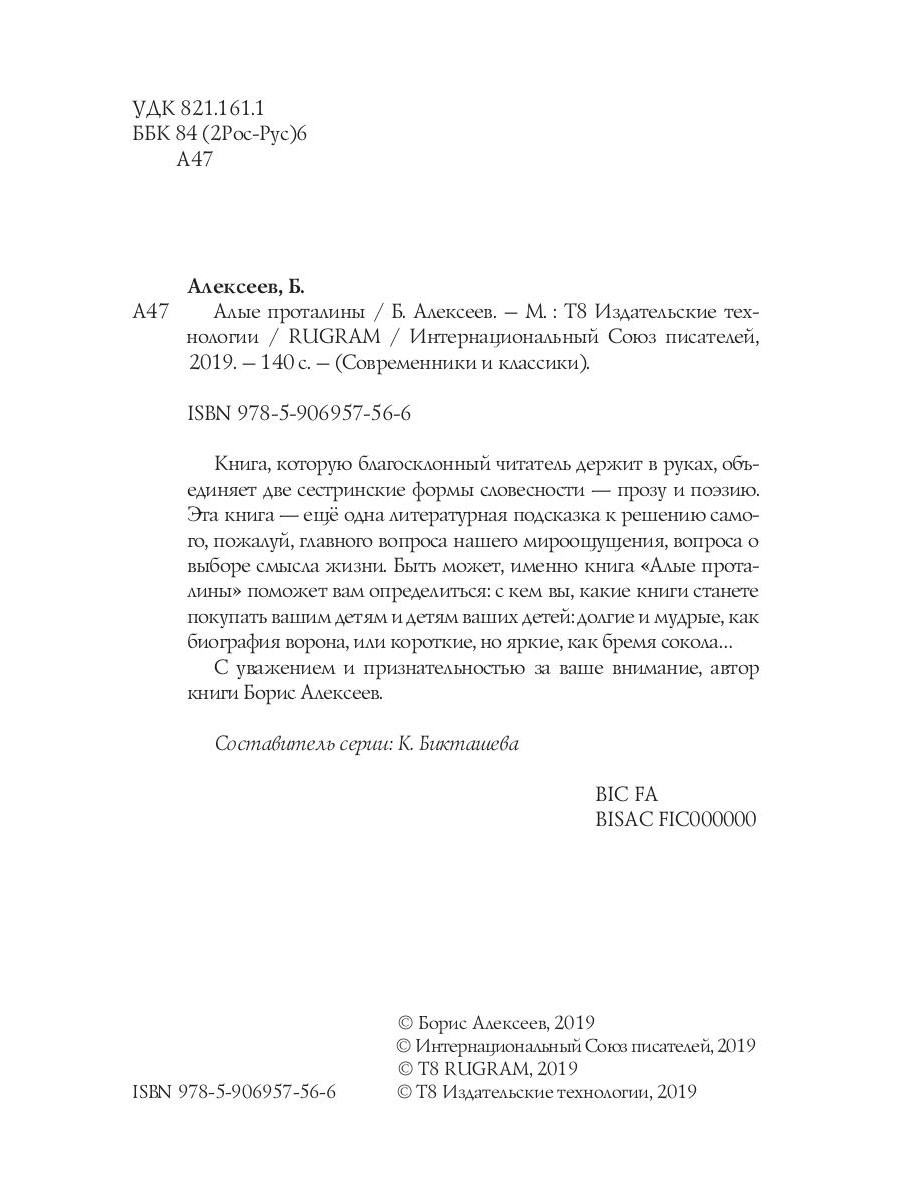 Книга, которую благосклонный читатель держит в руках, объединяет две сестринские формы словесности - прозу и поэзию. Эта книга - ещё одна литературная подсказка к решению самого, пожалуй, главного вопроса нашего мироощущения, вопроса о выборе смысла жизни. Быть может, именно книга «Алые проталины» поможет вам определиться: с кем вы, какие книги станете покупать вашим детям и детям ваших детей: долгие и мудрые, как биография ворона, или короткие, но яркие, как бремя сокола...