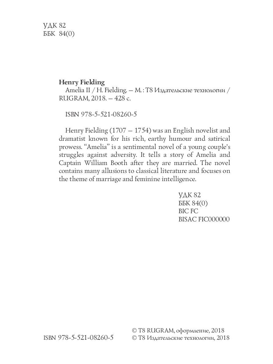Henry Fielding (1707 - 1754) was an English novelist and dramatist known for his rich, earthy humour and satirical prowess. "Amelia" is a sentimental novel of a young couple's struggles against adversity. It tells a story of Amelia and Captain William Booth after they are married. The novel contains many allusions to classical literature and focuses on the theme of marriage and feminine intelligence.| Издательство | Т8 RUGRAM |