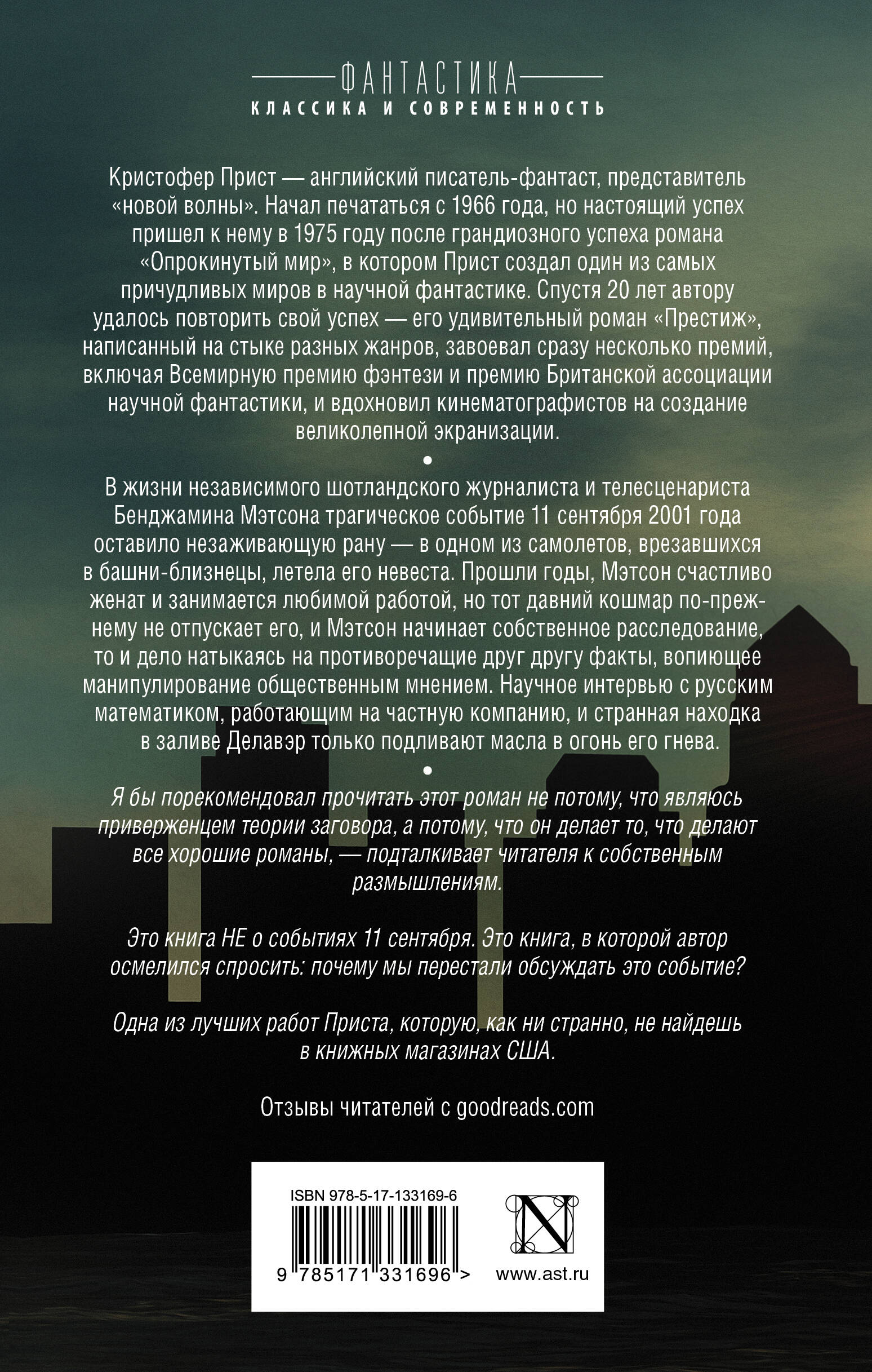 В жизни независимого шотландского журналиста и телесценариста Бенджамина Мэтсона трагическое событие 11 сентября 2001 года оставило незаживающую рану - в одном из самолетов, врезавшихся в башни-близнецы, летела его невеста. Прошли годы, Мэтсон счастливо женат и занимается любимой работой, но тот давний кошмар по-прежнему не отпускает его, и Мэтсон начинает собственное расследование, то и дело натыкаясь на противоречащие друг другу факты, вопиющее манипулирование общественным мнением. Научное интервью с русским математиком, работающим на частную компанию, и странная находка в заливе Делавэр только подливают масла в огонь его гнева.| Издательство | ИЗДАТЕЛЬСТВО "АСТ" |