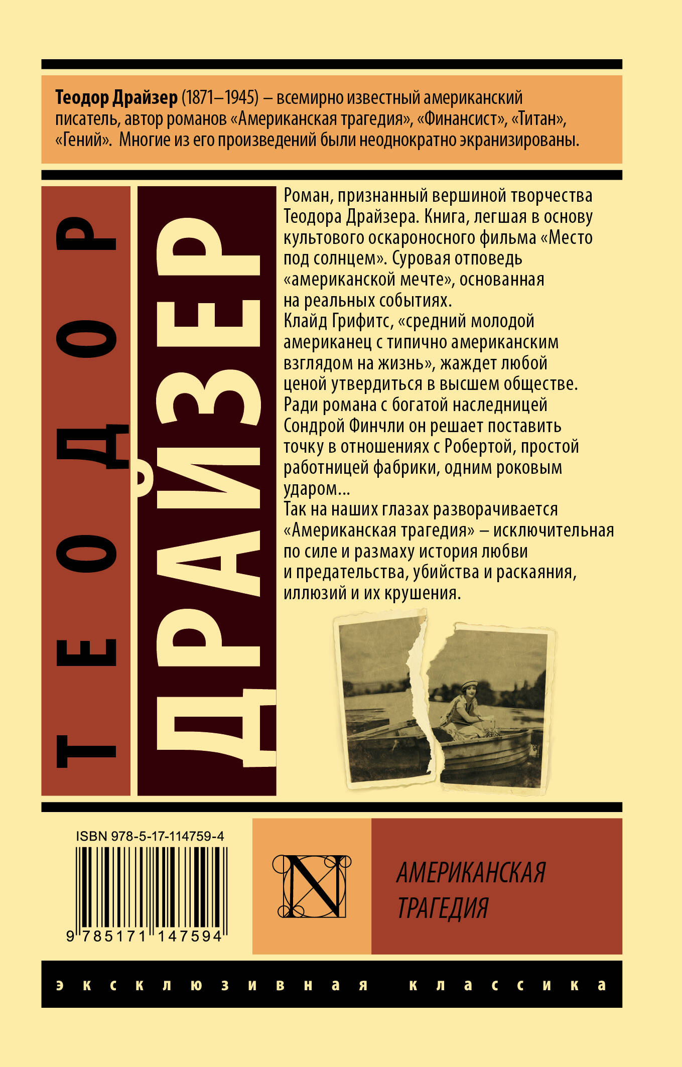 Роман, признанный вершиной творчества Теодора Драйзера. Книга, легшая в основу культового оскароносного фильма "Место под солнцем". Суровая отповедь "американской мечте", основанная на реальных событиях. Клайд Грифитс, "средний молодой американец с типично американским взглядом на жизнь", жаждет любой ценой утвердиться в высшем обществе. Ради романа с богатой наследницей Сондрой Финчли он решает поставить точку в отношениях с Робертой, простой работницей фабрики, одним роковым ударом… Так на наших глазах начинает разворачиваться "Американская трагедия" - исключительная по силе и размаху история любви и предательства, убийства и раскаяния, иллюзий и их крушения.