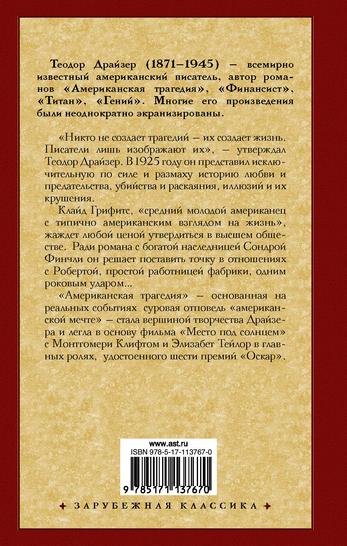 "Никто не создает трагедий - их создает жизнь. Писатели лишь изображают их", - утверждал Теодор Драйзер. В 1925 году он представил исключительную по силе и размаху историю любви и предательства, убийства и раскаяния, иллюзий и их крушения. Клайд Грифитс, "средний молодой американец с типично американским взглядом на жизнь", жаждет любой ценой утвердиться в высшем обществе. Ради романа с богатой наследницей Сондрой Финчли он решает поставить точку в отношениях с Робертой, простой работницей фабрики, одним роковым ударом… "Американская трагедия" - основанная на реальных событиях суровая отповедь "американской мечте" - стала вершиной творчества Драйзера и легла в основу фильма "Место под солнцем" с Монтгомери Клифтом и Элизабет Тейлор в главных ролях, удостоенного шести премий "Оскар".| Издательство | ИЗДАТЕЛЬСТВО "АСТ" |