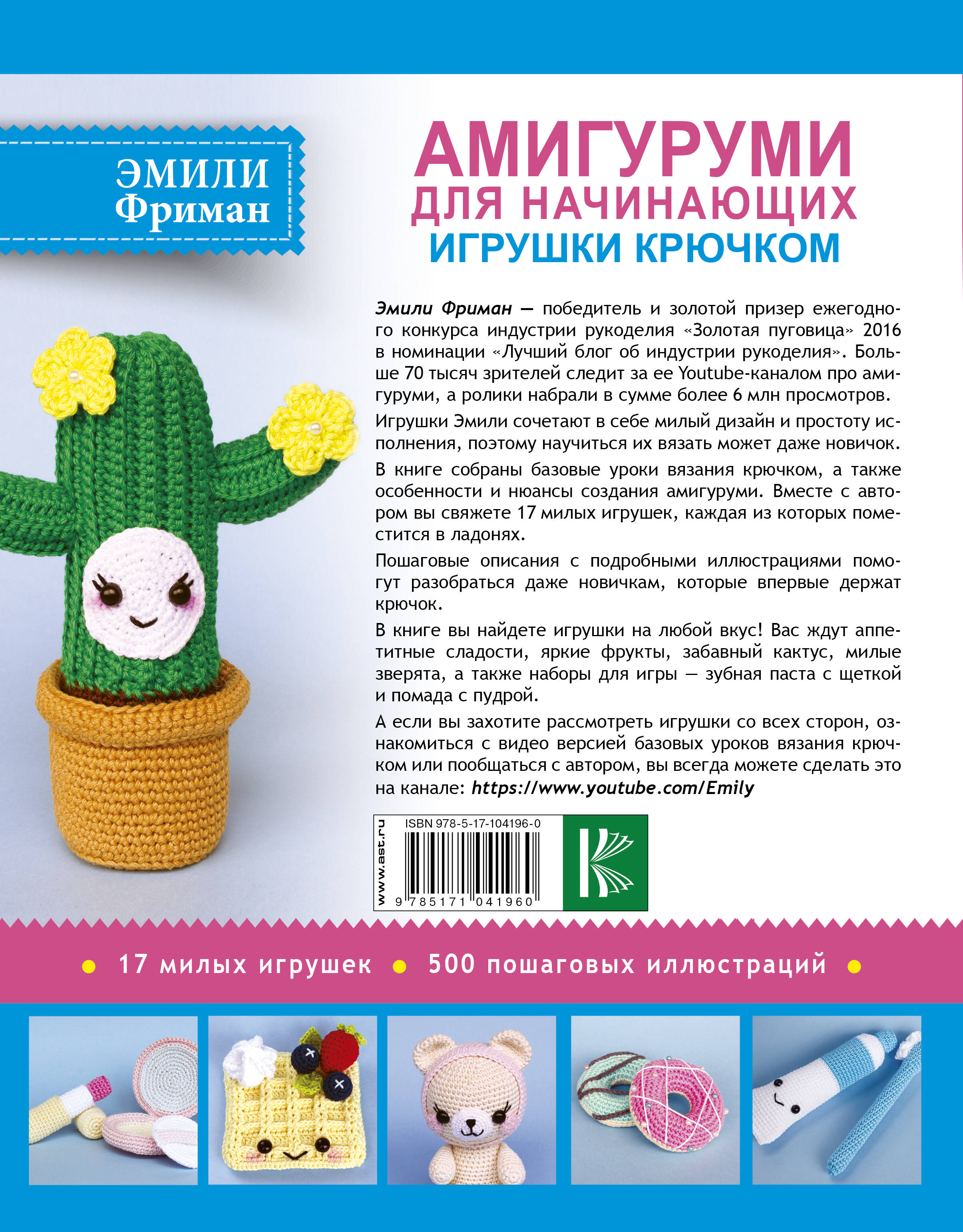 Если вы хотите научиться вязать крючком милые игрушки амигуруми, то книжка «Амигуруми для начинающих. Игрушки крючком» станет для вас лучшим помощником! Автор, Эмили Фриман, подобрала для своих читателей лучшие мастер-классы по созданию авторских игрушек. Вместе с ней вы свяжете сначала самые простые работы, а потом перейдете к более интересным и сложным игрушкам, а после, получив нужные знания и опыт, сможете придумывать и с легкостью воплощать в жизнь свои собственные идеи. В книжке собраны как базовые уроки вязания крючком, так и особенности создания амигуруми, а также даны подробные пошаговые описания действий, яркие красочные фотографии и советы автора для начинающих вязальщиц. Свяжите вместе с нами милое яблочко, аппетитные сладости или забавных зверят!| Издательство | Издательство "АСТ" |