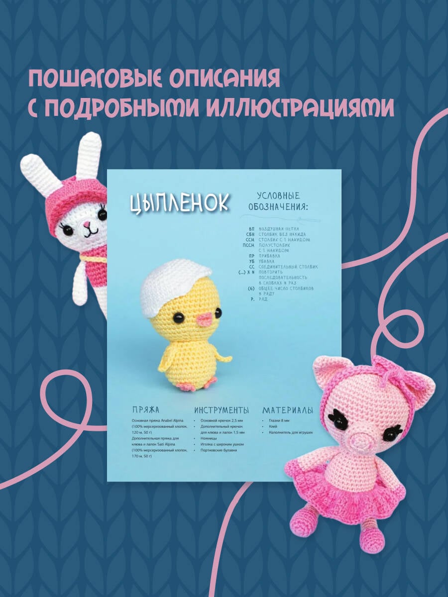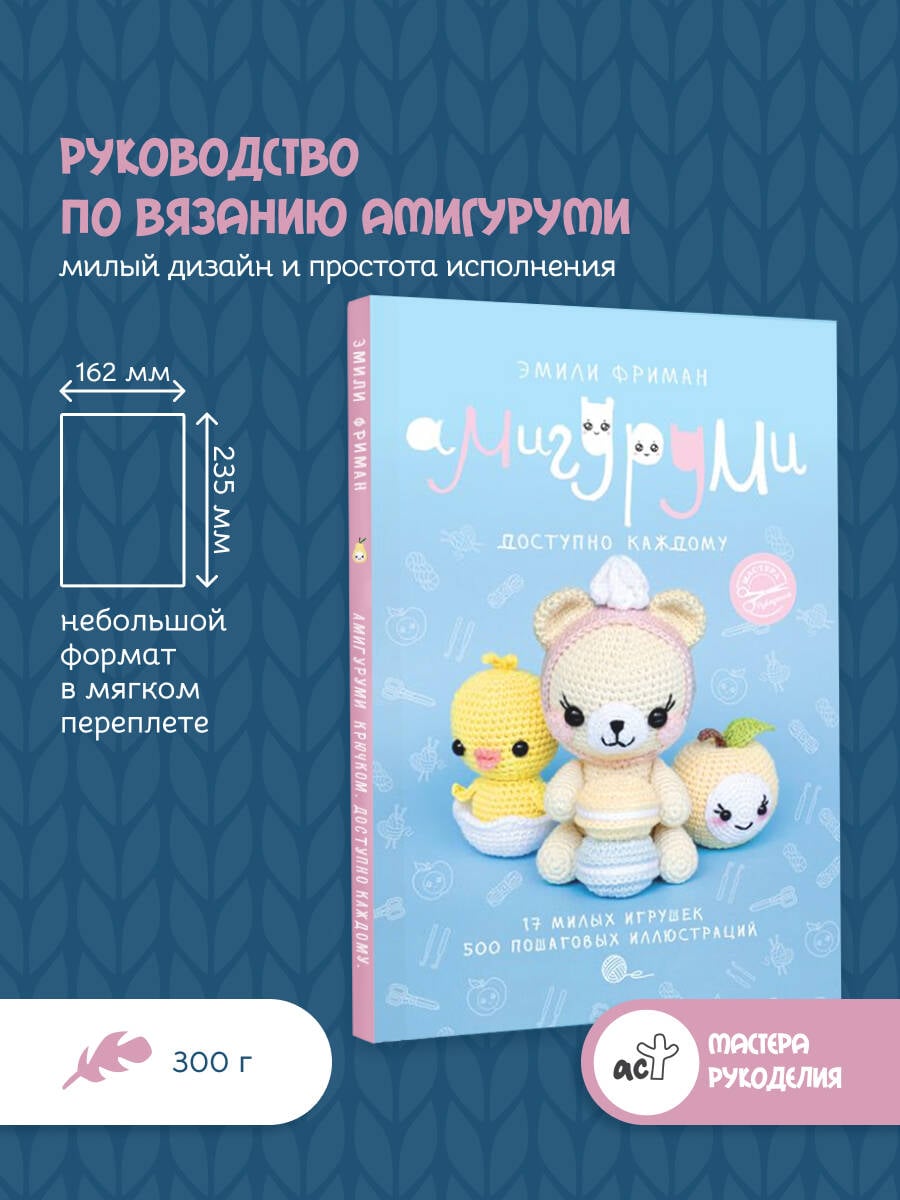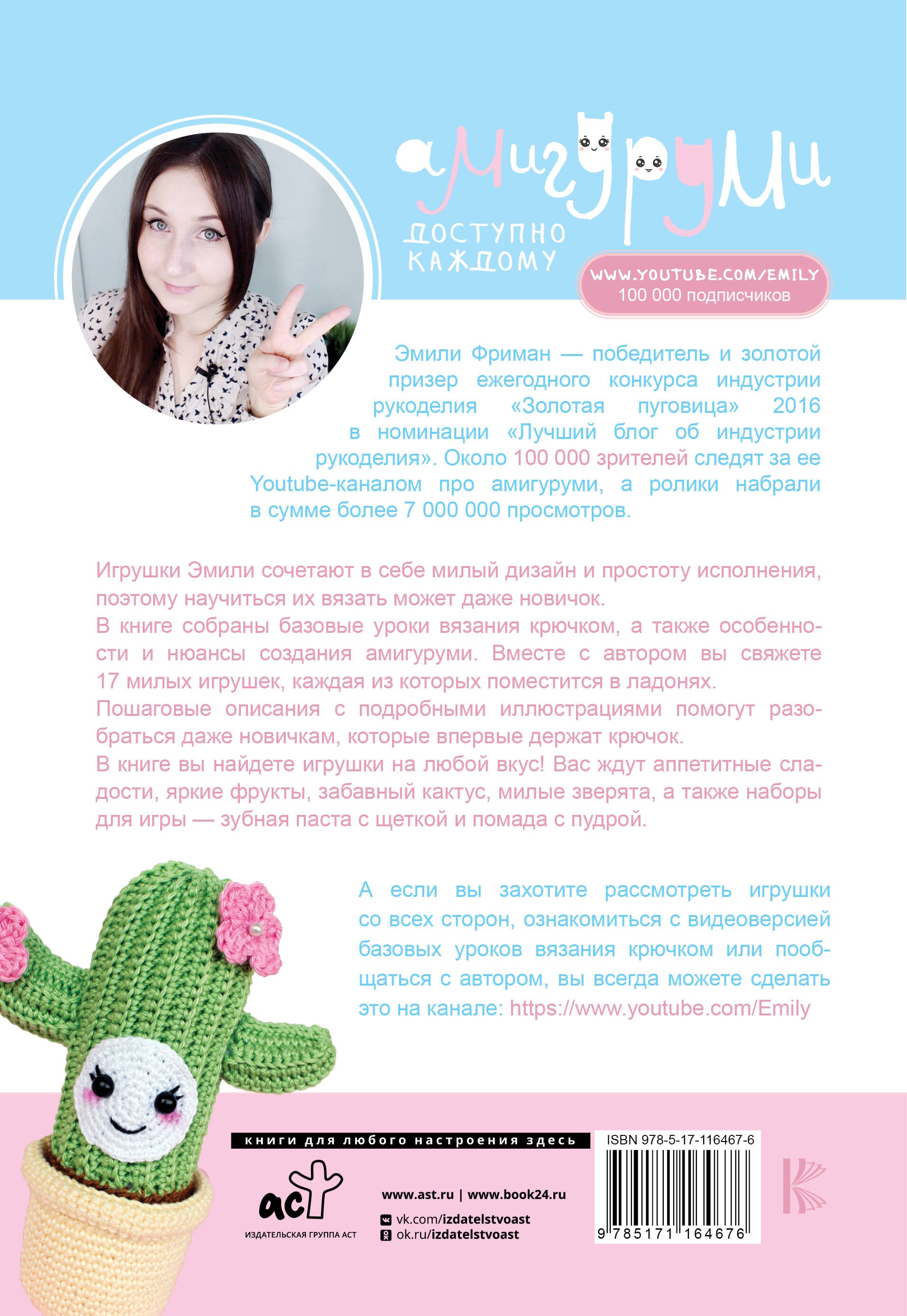 Эмили Фриман - победитель и золотой призер ежегодного конкурса индустрии рукоделия "Золотая пуговица" 2016 в номинации "Лучший блог об индустрии рукоделия". Около 100 тысяч зрителей следит за ее Youtube-каналом про амигуруми, а ролики набрали в сумме более 7 млн просмотров. Игрушки Эмили сочетают в себе милый дизайн и простоту исполнения, поэтому научиться их вязать может даже новичок. В книге собраны базовые уроки вязания крючком, а также особенности и нюансы создания амигуруми. Вместе с автором вы свяжете 17 милых игрушек, каждая из которых поместится в ладонях. Пошаговые описания с подробными иллюстрациями помогут разобраться даже новичкам, которые впервые держат крючок. В книге вы найдете игрушки на любой вкус! Вас ждут аппетитные сладости, яркие фрукты, забавный кактус, милые зверята, а также наборы для игры - зубная паста с щеткой и помада с пудрой. А если вы захотите рассмотреть игрушки со всех сторон, ознакомиться с видео-версией базовых уроков вязания крючком или пообщаться с автором, вы всегда можете сделать это на канале: https://www.youtube.com/Emily