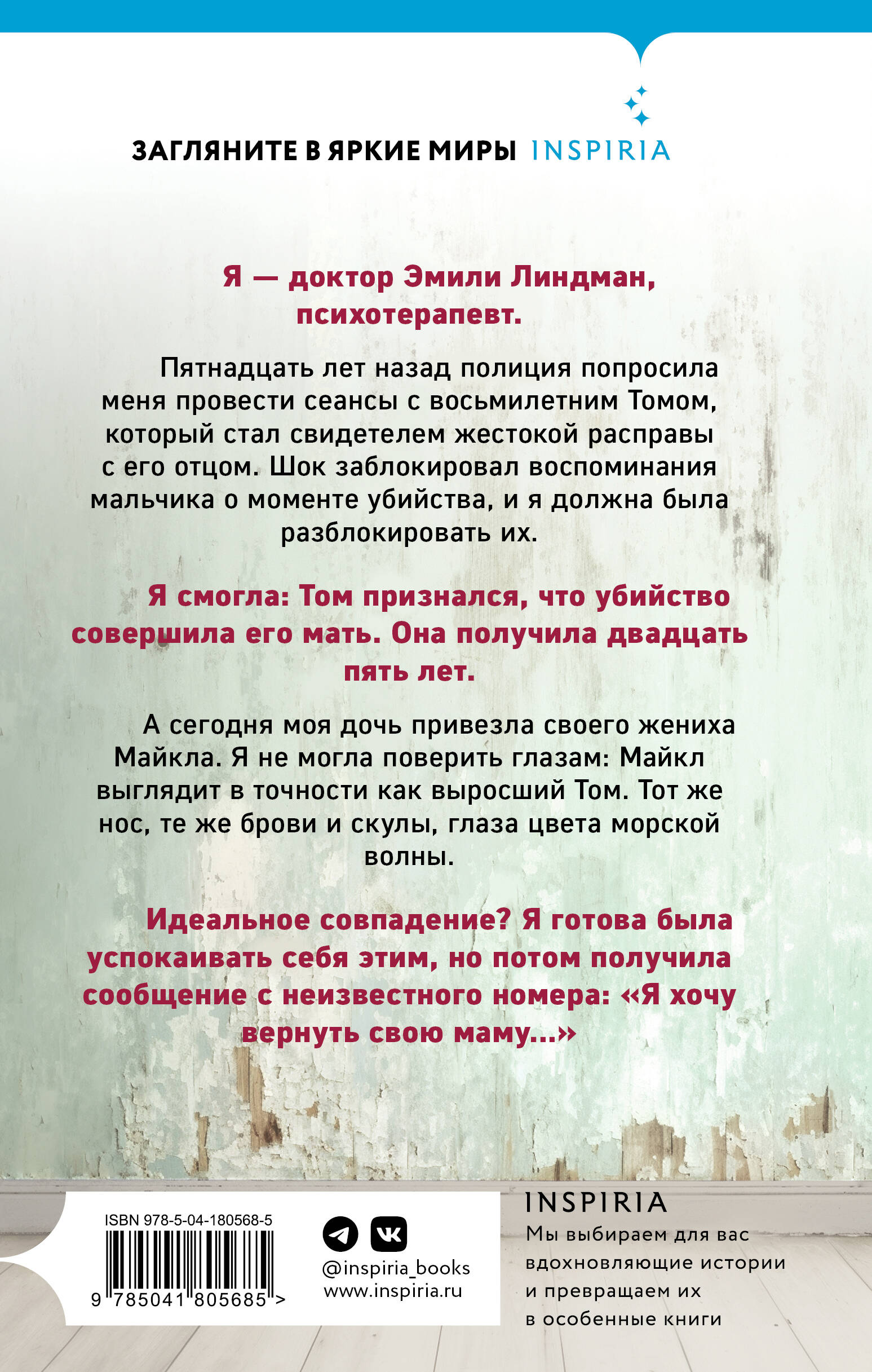 Психологический триллер № 1 на Amazon UK. Премия Next Generation Indie Book Awards 2022 в номинации «Лучший саспенс». Я УЗНАЛА ЕГО. 15 ЛЕТ НАЗАД ОН НАЗВАЛ СВОЮ МАТЬ УБИЙЦЕЙ. А ТЕПЕРЬ ПОДОБРАЛСЯ КО МНЕ… Я - доктор Эмили Линдман, психотерапевт. Пятнадцать лет назад полиция попросила меня провести сеансы с восьмилетним Томом, который стал свидетелем жестокой расправы с его отцом. Шок заблокировал воспоминания мальчика о моменте убийства, и я должна была разблокировать их. Я смогла: Том признался, что убийство совершила его мать. Она получила двадцать пять лет. А сегодня моя дочь привезла своего жениха Майкла. Я не могла поверить глазам: Майкл выглядит в точности как выросший Том. Тот же нос, те же брови и скулы, глаза цвета морской волны. Идеальное совпадение? Я готова была успокаивать себя этим, но потом получила сообщение с неизвестного номера: «Я ХОЧУ ВЕРНУТЬ СВОЮ МАМУ…»| Издательство | ООО "Издательство "Эксмо" |