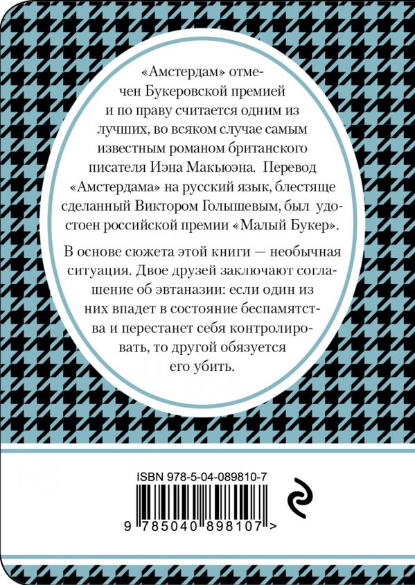 "Амстердам" отмечен Букеровской премией и по праву считается одним из лучших, во всяком случае, самым известным романом британского писателя Иэна Макьюэна. Перевод "Амстердама" на русский язык, блестяще сделанный Виктором Голышевым, был удостоен российской премии "Малый Букер".
