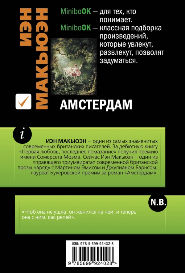 Иэн Макьюэн - один из авторов «правящего триумвирата» современной британской прозы (наряду с Джулианом Барнсом и Мартином Эмисом). Его «Амстердам» получил Букеровскую премию. Русский перевод романа стал интеллектуальным бестселлером, а работа Виктора Голышева была отмечена российской премией «Малый Букер», в первый и единственный раз присужденной именно за перевод.
