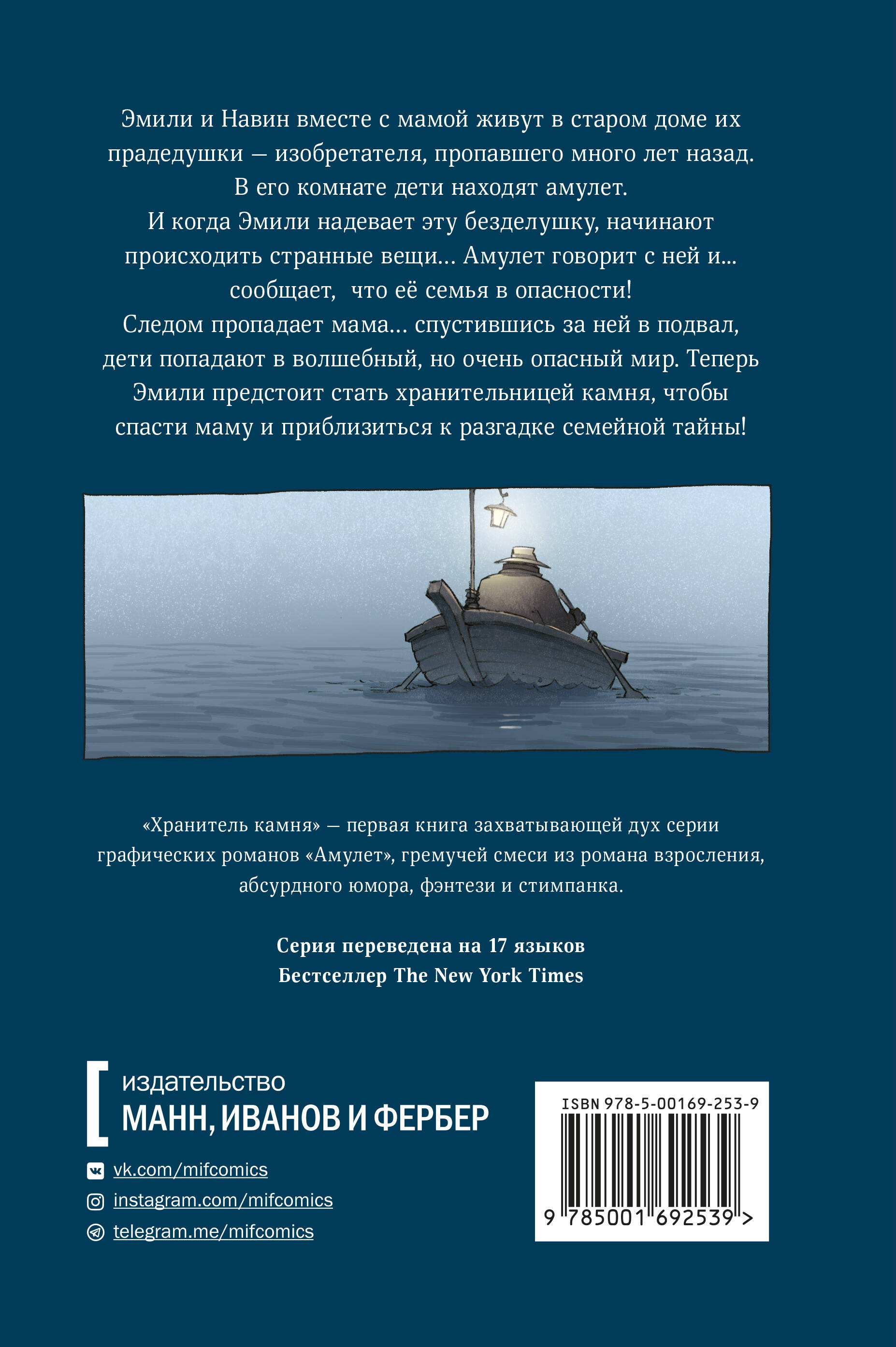 "Эмили и Навин вместе с мамой теперь живут в старом доме их прадедушки - изобретателя, пропавшего много лет назад. В его комнате дети находят амулет. И когда Эмили надевает эту безделушку, начинают происходить странные вещи… Амулет говорит с ней и... сообщает, что её семья в опасности! Следом пропадает мама… спустившись за ней в подвал, дети попадают в волшебный, но очень опасный мир. Теперь Эмили предстоит стать хранительницей камня, чтобы спасти маму и приблизиться к разгадке семейной тайны! "Хранитель камня" - первая книга захватывающей дух серии графических романов "Амулет", гремучей смеси из романа взросления, абсурдного юмора, фэнтези и стимпанка. Серия переведена на 17 языков и стала бестселлером The New York Times."