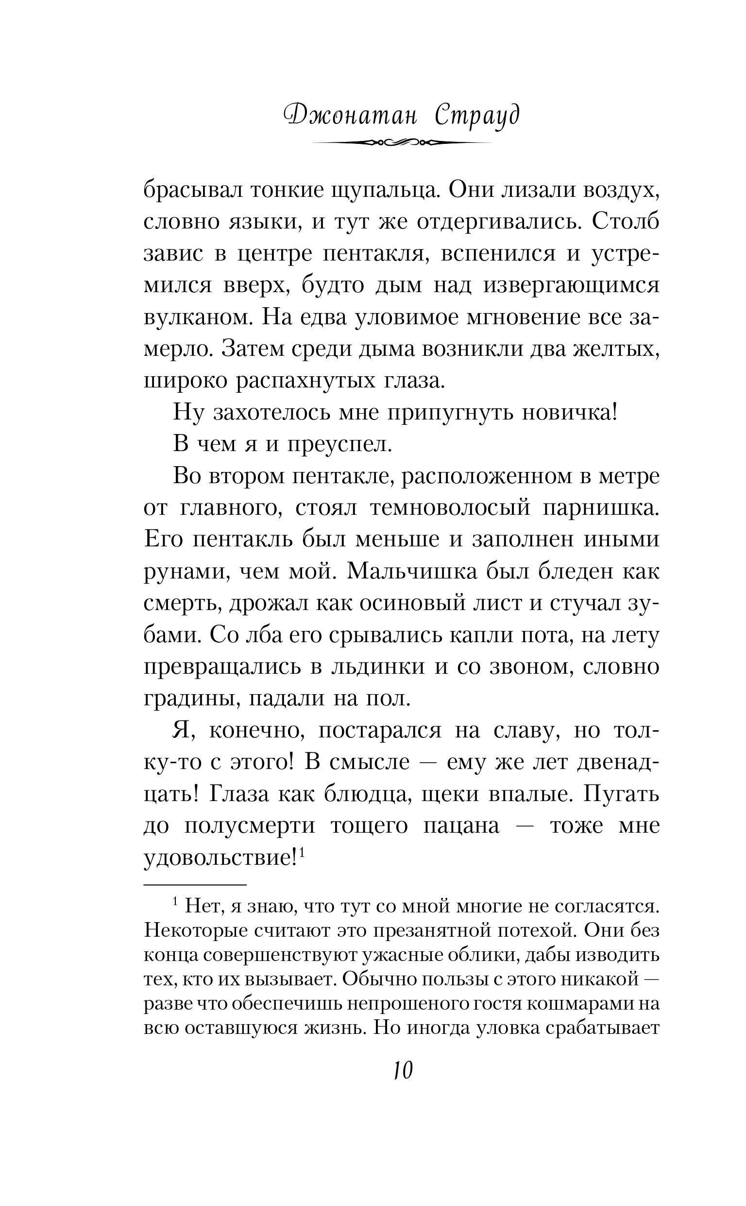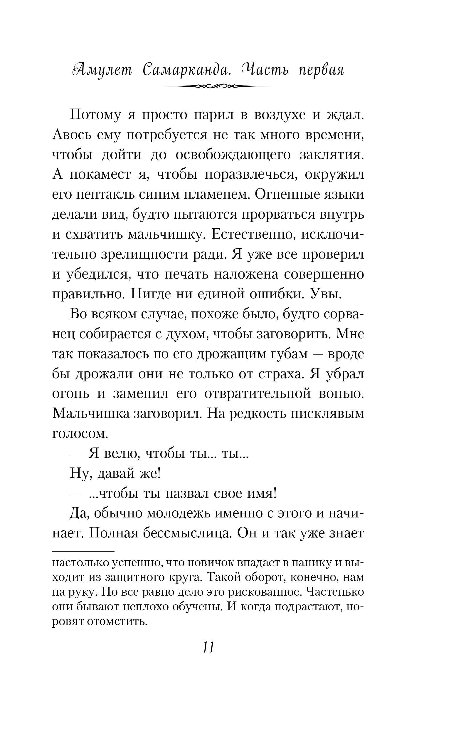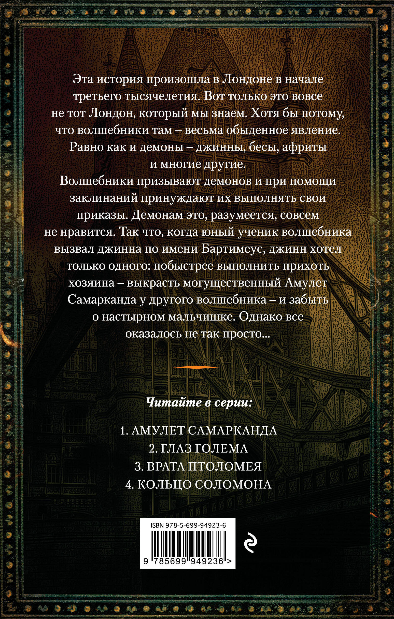 Это 1-я книга «Трилогии Бартимеуса». Попала во все престижные книжные рейтинги, стала бестселлером. Джонатан Страуд вошёл в список самых известных и издаваемых авторов фэнтези наряду с Джоан Роулинг, Терри Пратчеттом, Риком Риорданом, Филипом Пулманом. Именно этот цикл автора удостоился Мифопоэтической премии, которая присуждается за выдающиеся произведения в жанре фэнтези, развивающие традиции Дж. Р.Р. Толкина и К. Льюиса. «Трилогия Бартимеуса» способна заинтересовать даже тех, кто до сегодняшнего дня был далёк от мира фантастики. Эта история произошла в Лондоне в начале третьего тысячелетия. Вот только это вовсе не тот Лондон, который мы знаем. Хотя бы потому, что волшебники там - весьма обыденное явление. Равно как и демоны - джинны, бесы, африты и многие другие. Волшебники призывают демонов и при помощи заклинаний принуждают их выполнять свои приказы. Демонам это, разумеется, совсем не нравится. Так что, когда юный ученик волшебника вызвал джинна по имени Бартимеус, джинн хотел только одного: побыстрее выполнить прихоть хозяина - выкрасть могущественный Амулет Самарканда у другого волшебника - и забыть о настырном мальчишке. Однако все оказалось не так просто…| Издательство | ООО "Издательство "Эксмо" |