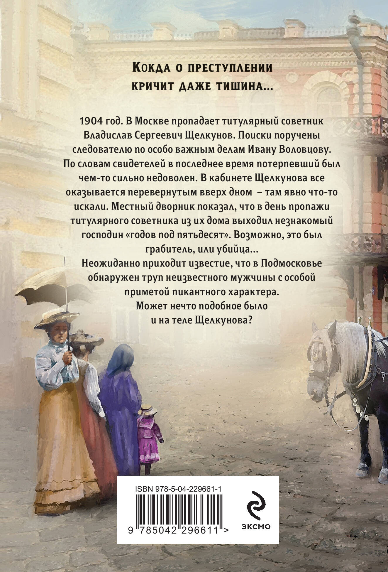 Когда о преступлении кричит даже тишина… 1904 год. В Москве пропадает титулярный советник Владислав Сергеевич Щелкунов. Поиски поручены следователю по особо важным делам Ивану Воловцову. По словам свидетелей, в последнее время потерпевший был чем-то сильно недоволен. В кабинете Щелкунова все оказывается перевернутым вверх дном - там явно что-то искали. Местный дворник показал, что в день пропажи титулярного советника из их дома выходил незнакомый господин «годов под пятьдесят». Возможно, это и был грабитель или убийца… Неожиданно приходит известие, что в Подмосковье обнаружен труп неизвестного мужчины с особой приметой пикантного характера. Может быть, нечто подобное было и на теле Щелкунова? Исторический детектив о преступлении начала прошлого века. Автор настолько увлекательно погружает в атмосферу того времени, что мы буквально слышим грохот мостовой, шум городского базара, звон колоколов и пронзительные свистки городовых…| Издательство | ООО "Издательство "Эксмо" |