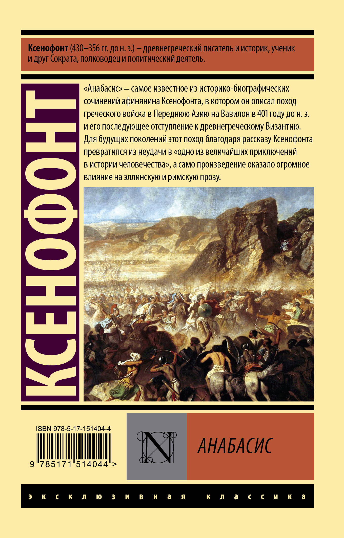 Ксенофонт (430 г. до н.э. - 356 г. до н.э.) - древнегреческий писатель и историк, ученик и друг Сократа, полководец и политический деятель. "Анабасис" - самое известное из историко-биографических сочинений афинянина Ксенофонта, в котором он описал поход греческого войска в Переднюю Азию на Вавилон в 401 году до н.э. и его последующее отступление к древнегреческому Византию. Для будущих поколений этот поход благодаря рассказу Ксенофонта превратился из неудачи в "одно из величайших приключений в истории человечества", а само произведение оказало огромное влияние на эллинскую и римскую прозу.