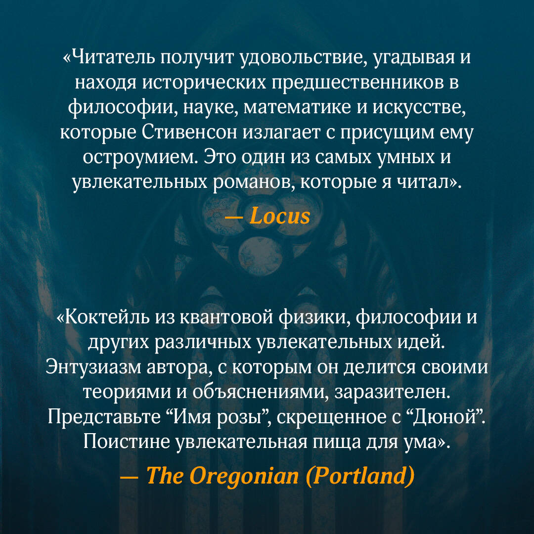 Великолепное произведение от автора бестселлеров «Лавина», «Алмазный век», «Криптономикон» и трилогии «Барочного цикла» - масштабная история, которая погружает читателя в причудливо перевернутый, но все еще узнаваемый мир. Премии «Локус», «Портал», «Итоги года» журнала «Мир Фантастики». Номинации на премии «Хьюго», Артура Ч. Кларка, Мемориальную премию Джона Кэмпбелла, премию Британской ассоциации научной фантастики, премию «Индевор». Фраа Эразмас - молодой монах-инак, живущий в конценте (когда-то их называли обителями) святителя Эдхара, убежище математиков и философов. Это монастырь, защищающий ученых от пагубного влияния внешнего светского мира как древними каменными стенами, так и сложными ритуалами и традициями. На протяжении веков за стенами концента возводились и рушились города и государства. Трижды, в самые темные эпохи истории, насилие, порожденное суеверием и невежеством, вторгалось и опустошало замкнутое общество математической науки. Однако монахам-ученым удавалось адаптироваться после катастроф, став более аскетичными и менее зависимыми от технологий и идеологии материализма. Эразмас, однако, не страшится внешнего мира, ведь все эти трагические события превратились в древнюю историю. Раз в десятилетие наступает день обряда аперт, когда ворота концента широко распахиваются, чтобы пусть внутрь любопытствующих мирян, экстов, и выпустить в мир монахов-инаков. В свой первый аперт Эразмас с нетерпением ждет встречи с родными и близкими, которых он не видел с тех пор, как ушел в концент. Но не пройдет и недели, как и его прежняя жизнь, и та, которую он принял, окажутся на грани опасных перемен. Могущественные силы угрожают мирной и стабильной жизни монахов-ученых. Противостоять им может только хрупкий союз между инаками и экстами. Один за другим коллеги Эразмаса выходят из безопасного концента, в надежде предотвратить глобальную катастрофу. Случайно взвалив на себя ответственность за судьбу мира, Эразмас оказывается главным действующим лицом в драме, которая определит будущее всего сущего, и отправится в необычное путешествие, которое приведет его в самые опасные и негостеприимные уголки незнакомой планеты… и далеко за ее пределы. «Чтение данного романа - потрясающий опыт». - Washington Post «Обширное исследование, которое доставит удовольствие всем тем, кто любит сложные альтернативные миры и понимает иронию». - Kirkus Reviews «Бурное и эмоциональное повествование Стивенсона перекликается с классическим "Гимном Лейбовица" Уолтера Миллера, космическими операми Ларри Нивена и философскими размышлениями Дугласа Хофштадтера - пьянящая смесь предшественников, которая обеспечивает множество часов великолепного развлечения». - Publishers Weekly «Остроумный и запутанный… Гениальный… Его блеск неоспорим». - Locus «Читатель получит удовольствие, угадывая и находя исторических предшественников в философии, науке, математике и искусстве, которые Стивенсон излагает с присущим ему остроумием. Это один из самых умных и увлекательных романов, которые я читал». - Locus «Писатель из Сиэтла, который представляет собой нечто среднее между Уильямом Гибсоном и Ричардом Пауэрсом. Он умеет рассказывать истории, исследовать технологии и пересказывать абсолютно все, что попадается ему на глаза». - The Oregonian «Захватывающая смесь столкновения культур,