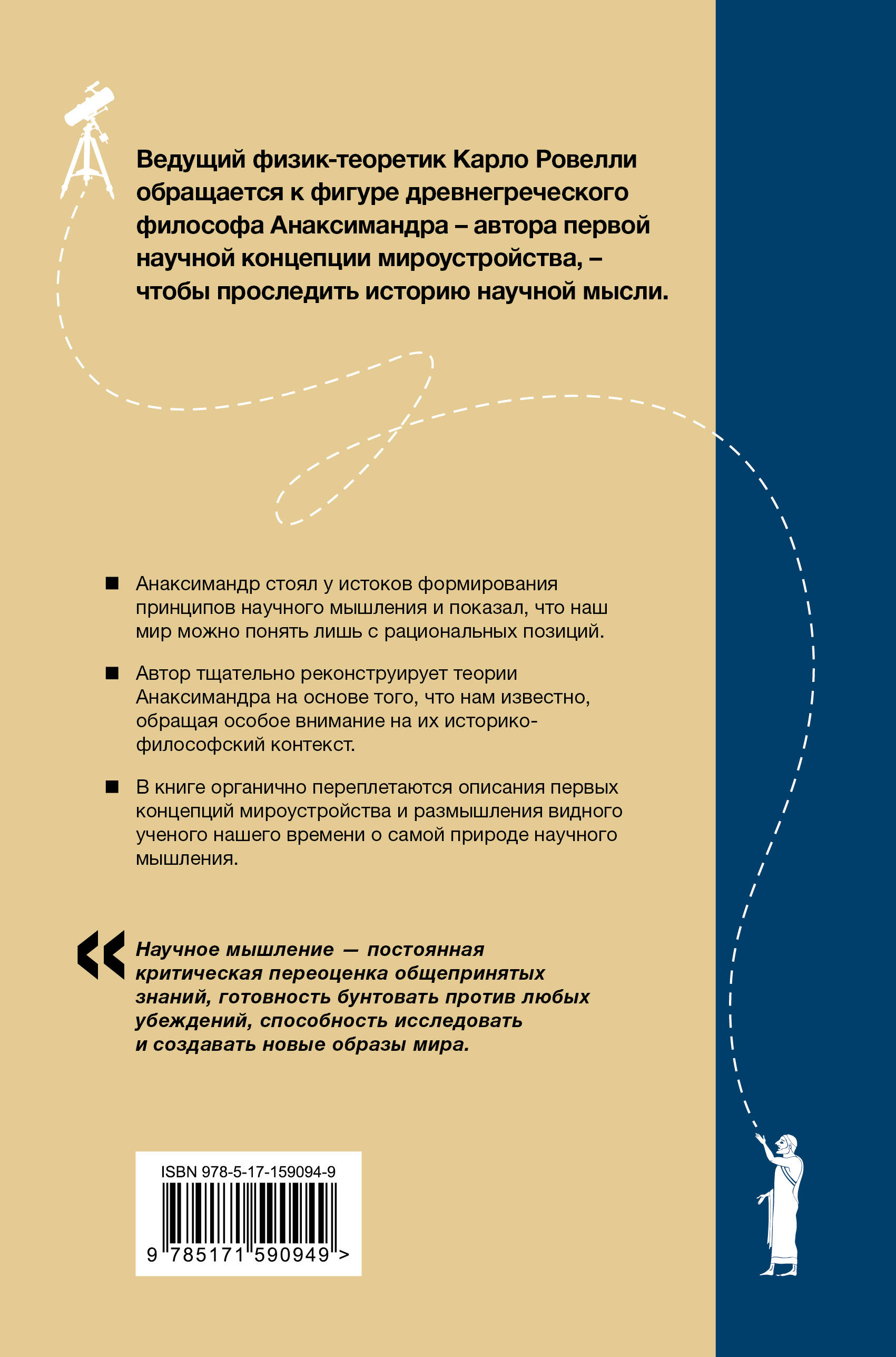 Ведущий физик-теоретик Карло Ровелли обращается к фигуре древнегреческого философа Анаксимандра - автора первой научной концепции мироустройства, - чтобы проследить историю научной мысли. Автор тщательно реконструирует теории Анаксимандра на основе того, что нам известно, обращая особое внимание на их историко-философский контекст. В книге органично переплетаются описания первых концепций мироустройства и размышления видного ученого нашего времени о самой природе научного мышления.| Издательство | Издательство "АСТ" |