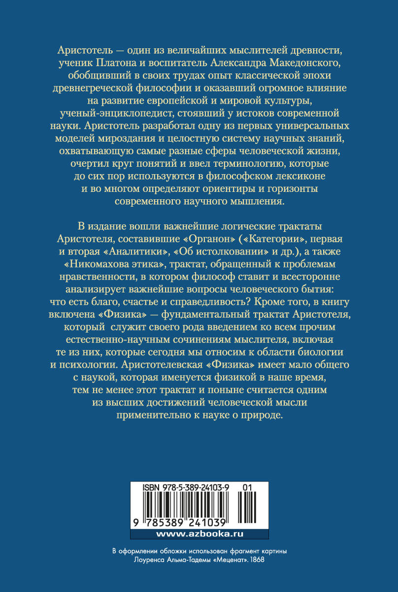 Аристотель - один из величайших мыслителей древности, ученик Платона и воспитатель Александра Македонского, обобщивший в своих трудах опыт классической эпохи древнегреческой философии и оказавший огромное влияние на развитие европейской и мировой культуры, ученый-энциклопедист, стоявший у истоков современной науки. Аристотель разработал одну из первых универсальных моделей мироздания и целостную систему научных знаний, охватывающую самые разные сферы человеческой жизни, очертил круг понятий и ввел терминологию, которые до сих пор используются в философском лексиконе и во многом определяют ориентиры и горизонты современного научного мышления. В издание вошли важнейшие логические трактаты Аристотеля, составившие "Органон" ("Категории", первая и вторая "Аналитики", "Об истолковании" и др.), а также "Никомахова этика", трактат, обращенный к проблемам нравственности, в котором философ ставит и всесторонне анализирует важнейшие вопросы человеческого бытия: что есть благо, счастье и справедливость? Кроме того, в книгу включена "Физика" - фундаментальный трактат Аристотеля, который служит своего рода введением ко всем прочим естественно-научным сочинениям мыслителя, включая те из них, которые сегодня мы относим к области биологии и психологии. Аристотелевская "Физика" имеет мало общего с наукой, которая именуется физикой в наше время, тем не менее этот трактат и поныне считается одним из высших достижений человеческой мысли применительно к науке о природе.| Издательство | Издательство АЗБУКА ООО |