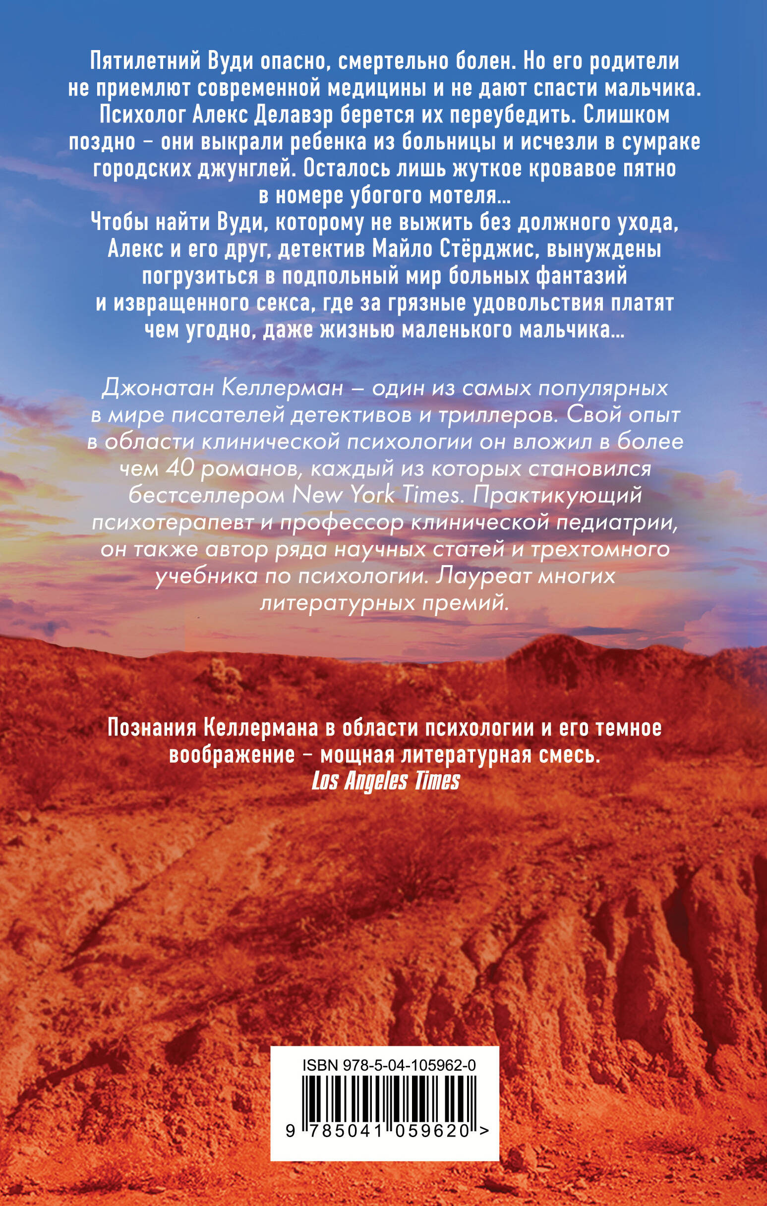 Раннее дело всемирно известного блестящего дуэта, Алекса Делавэра и Майло Стёрджиса. Бестселлер New York Times. Джонатан Келлерман - один из самых популярных в мире писателей детективов и триллеров. Свой опыт в области клинической психологии он вложил в более чем 40 романов, каждый из которых становился бестселлером New York Times. Практикующий психотерапевт и профессор клинической педиатрии, он также автор ряда научных статей и трехтомного учебника по психологии. Лауреат многих литературных премий. Пятилетний Вуди опасно, смертельно болен. Но его родители не приемлют современной медицины и не дают спасти мальчика. Психолог Алекс Делавэр берется их переубедить. Cлишком поздно - они выкрали ребенка из больницы и исчезли в сумраке городских джунглей. Осталось лишь жуткое кровавое пятно в номере убогого мотеля… Чтобы найти Вуди, которому не выжить без должного ухода, Алекс и его друг, детектив Майло Стёрджис, вынуждены погрузиться в подпольный мир больных фантазий и извращенного секса, где за грязные удовольствия платят чем угодно, даже жизнью маленького мальчика… «Мощный триллер, где героям приходится искать разгадку в самых темных закоулках человеческой души». - The Wall Street Journal «Познания Келлермана в области психологии и его темное воображение - мощная литературная смесь». - Los Angeles Times| Издательство | ООО "Издательство "Эксмо" |