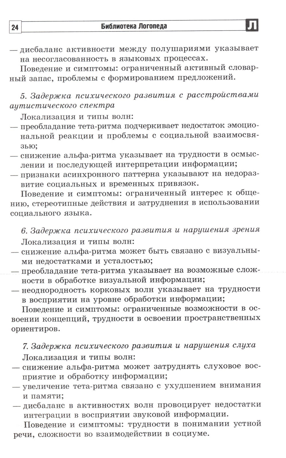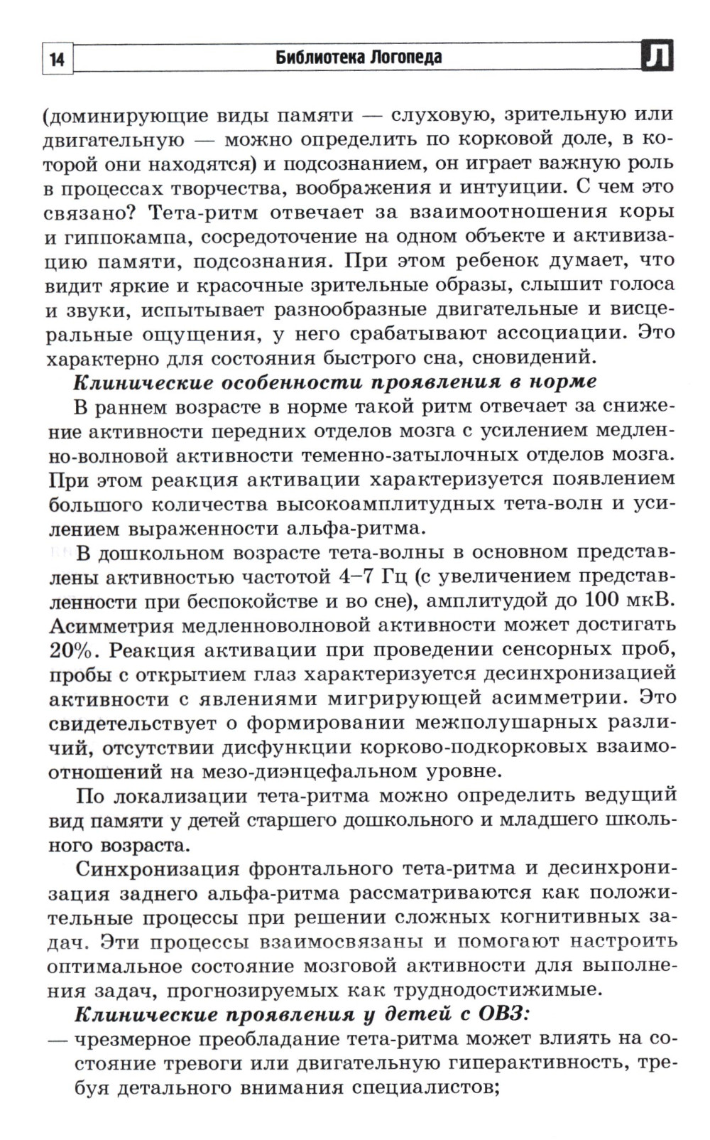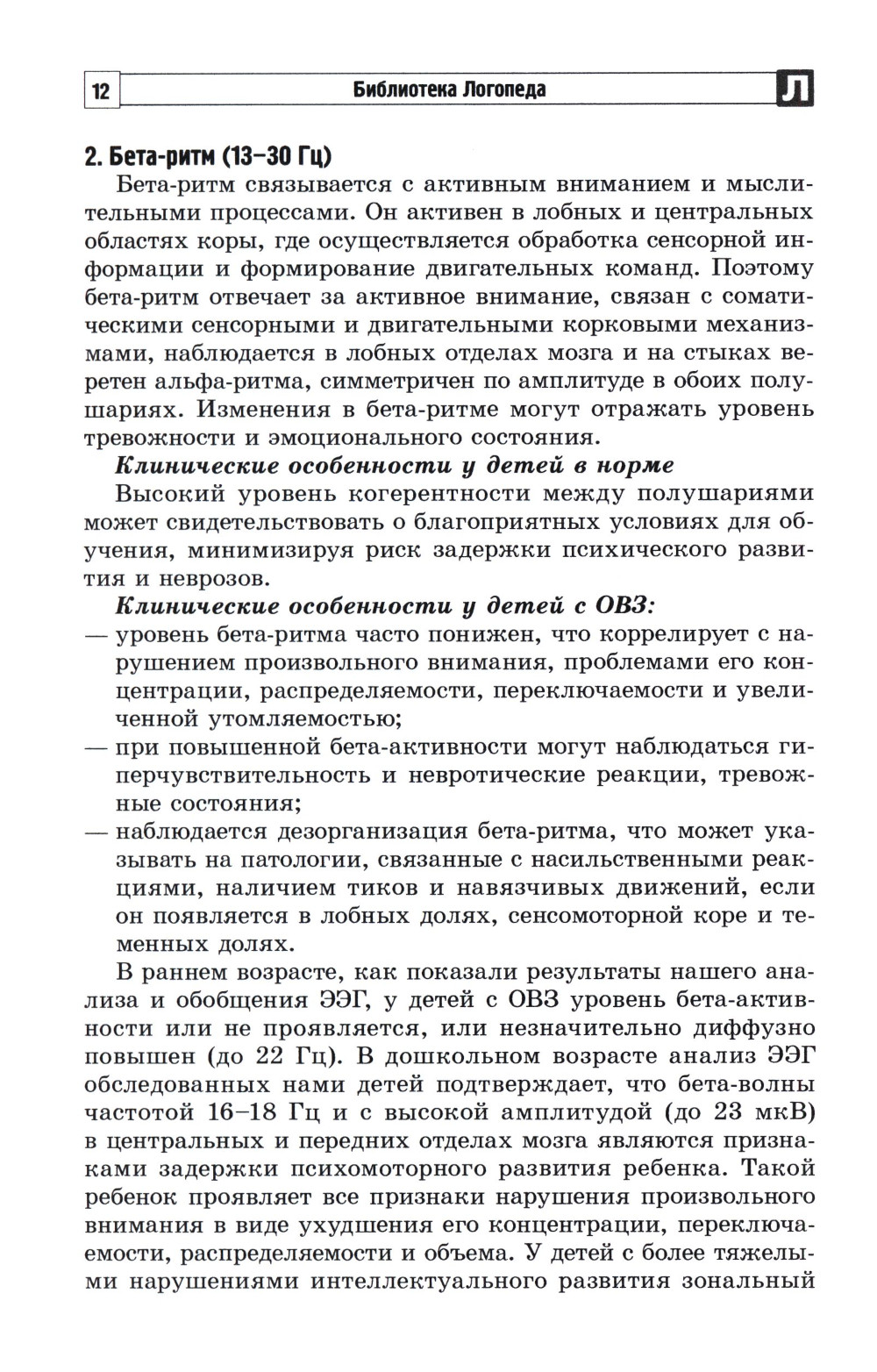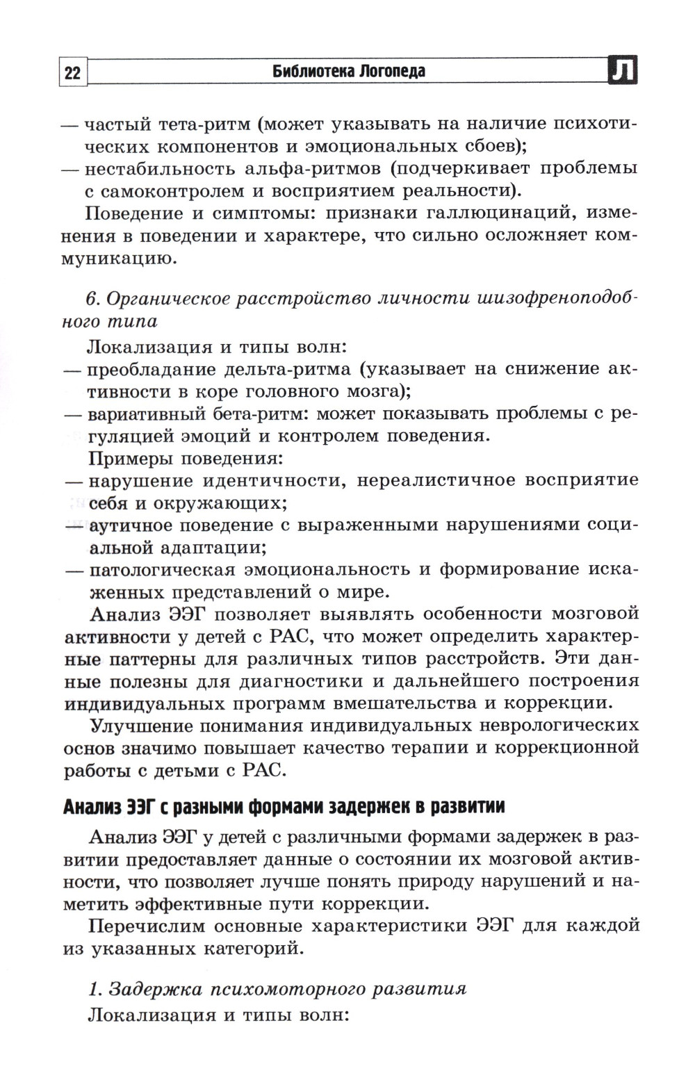 У вас в руках первая часть руководства по анализу волновой активности мозга с использованием электроэнцефалографии (ЭЭГ) и магнитно-резонансной томографии (МРТ) в контексте работы с детьми с ОВЗ. Она начинается с обсуждения основных понятий, а затем подробно рассматриваются различные волновые ритмы (альфа-, бета-, тета- и дельта-ритмы) и их клинические особенности как в норме, так и при ОВЗ. Методика консультирования нейрофизиологом учителей-дефектологов и логопедов основана на структурированном подходе, охватывающем сбор информации о ребенке, описание исследуемых методов, итоги анализа ЭЭГ и МРТ, а также рекомендации по дальнейшим обследованиям. Важный элемент книги - методика биологической обратной связи, внедряющая альфа-тренинг для оптимизации работы мозга и улучшения общей способности к обучению у детей с ОВЗ, который может проводиться нейропсихологами, учителям-лого-педами и дефектологами. Книга полезна как практикующим специалистам в области коррекционного обучения, так и родителям, стремящимся понять методы диагностики и коррекции, основанные на современных нейрофизиологических исследованиях.| Издательство | Творческий центр Сфера |
