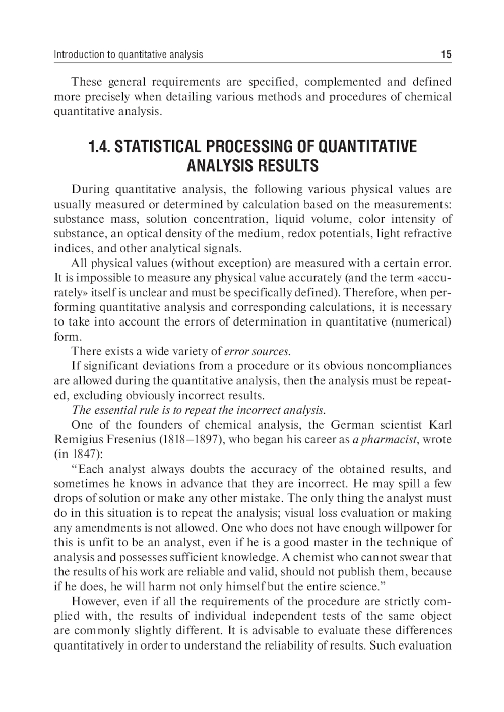 The textbook is prepared in accordance with the 3rd generation federal state educational standard. The book discusses the foundations of gravimetric, chemical titrimetric analysis methods (acid-base, oxidation-reduction, compleximetric including complexometry, precipitation titration in non-aqueous media), physical-chemical and physical methods: optical (colorimetry, photoelectrocolorimetry, spectrophotometry, fl uorimetry), chromatographic (ion exchange, gas-liquid, high performance liquid chromatography), electrochemical (conductometry, potentiometry, polarography, amperometry, coulometry). The methods of statistical processing of the quantitative analysis results are characterized. Examples and exercises are provided. The textbook is intended for university students of pharmacy, chemistry, and other disciplines that include a course of analytical chemistry.| Издательство | ГЭОТАР-Медиа |
