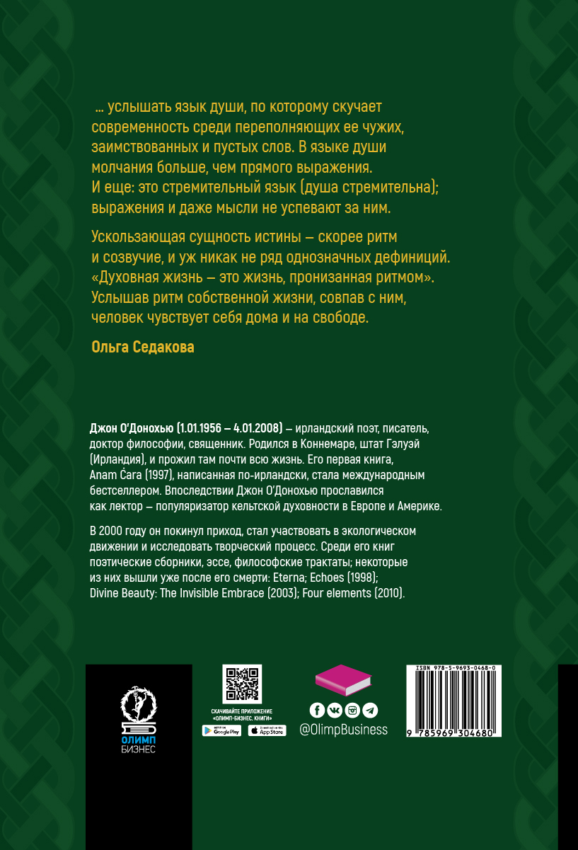 «Anam Сага. Кельтская мудрость» - книга о жизни и одновременно книга жизни. Ирландский поэт, философ, священник Джон О'Донохью - носитель, а не исследователь кельтской культуры, - подобно «другу души», апаш сага, знает о нас и об окружающем нас мире больше, чем мы сами. Перемежая прозу и поэзию, он «переоткрывает» ставшую невидимой сегодня жизнь, далекую от спешки, автоматизма, штампов и уничтожения «себя настоящего». Дружба, любовь, душевность, умение смотреть и видеть, слушать и слышать, воспринимать каждое утро как дар и радость открытия, становиться мудрым и не бояться, - вот всего лишь несколько мотивов книги. Это текст, который хочется разобрать на цитаты, делиться им и бесконечно к нему возвращаться, чтобы не забывать «как жить». Рекомендуется всем любителям «медленного» - столь редкого теперь - чтения с наслаждением.| Издательство | Олимп-Бизнес |