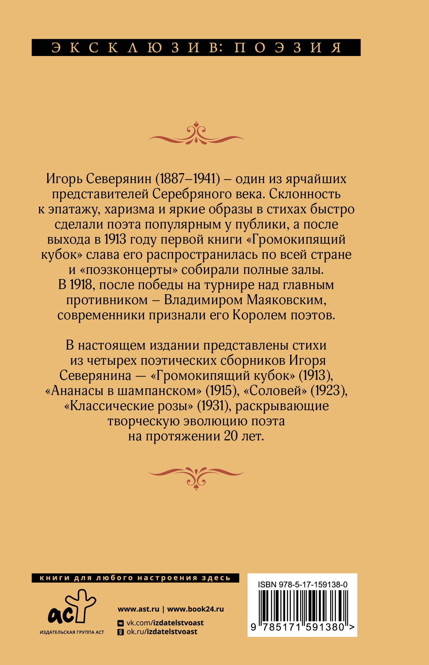 В настоящем издании представлены стихи из четырех поэтических сборников Игоря Северянина - "Громокипящий кубок" (1913), "Ананасы в шампанском" (1915), "Соловей" (1923), "Классические розы" (1931), раскрывающие творческую эволюцию поэта на протяжении 20 лет.| Издательство | Издательство "АСТ" |