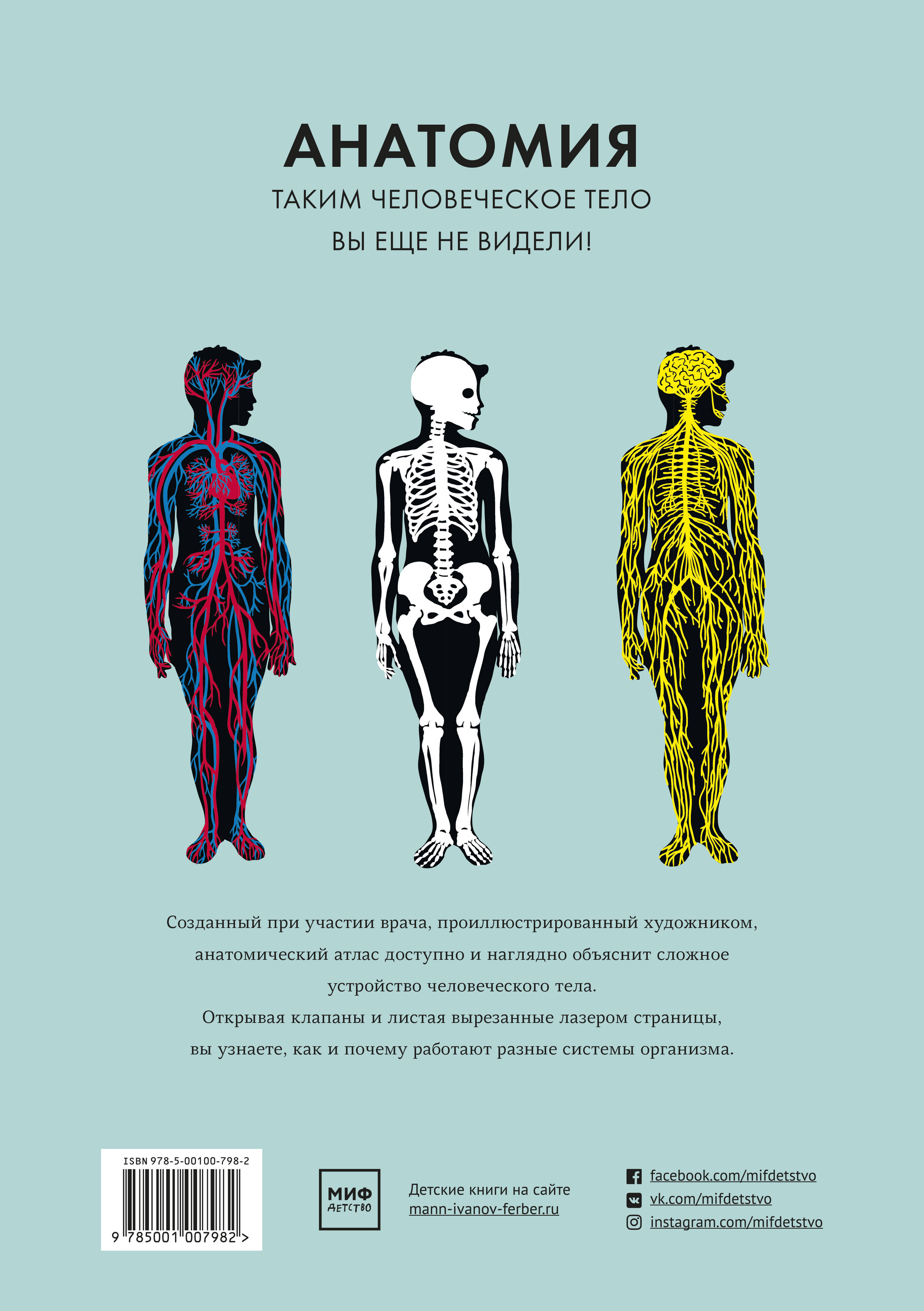 "Созданный при участии врача, проиллюстрированный художником, анатомический атлас доступно и наглядно объяснит сложное устройство человеческого тела. Открывая клапаны и листая вырезанные лазером страницы, вы узнаете, как и почему работают разные системы организма. "| Издательство | Манн, Иванов и Фербер |