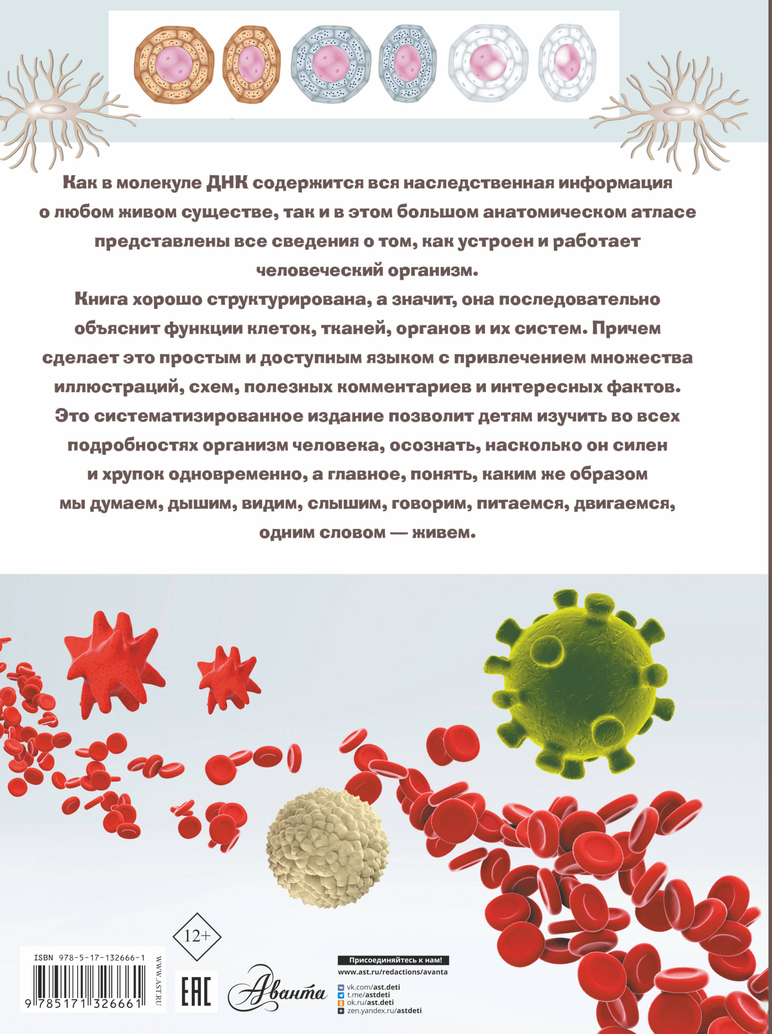 Ты можешь себе представить сложнейший механизм, состоящий более чем из 50 триллионов мельчайших деталей, которые работают в тесном взаимодействии? А ведь примерно таким является твой собственный организм. Составляющие его "кирпичики" - клетки - объединяются в ткани, ткани - в органы, органы - в системы органов, и все они взаимосвязано функционируют, выполняя определенные задачи. Разобраться в этой непростой теме сложно даже взрослым, а тебе в этом поможет данный атлас анатомии человека. На его страницах ты найдешь множество иллюстраций, которые во всех подробностях представляют строение тех или иных органов и частей тела и буквально пошагово показывают, как они работают. В конце каждой темы тебя ждут странички с какими-то забавными и важными фактами, которые вначале заинтересуют, а затем заставят поверить, каким же на самом деле удивительным является наш организм. Все это делает знакомство с анатомией человека не только познавательным, но и весьма увлекательным, поверь - скучно не будет! Для среднего и старшего школьного возраста.