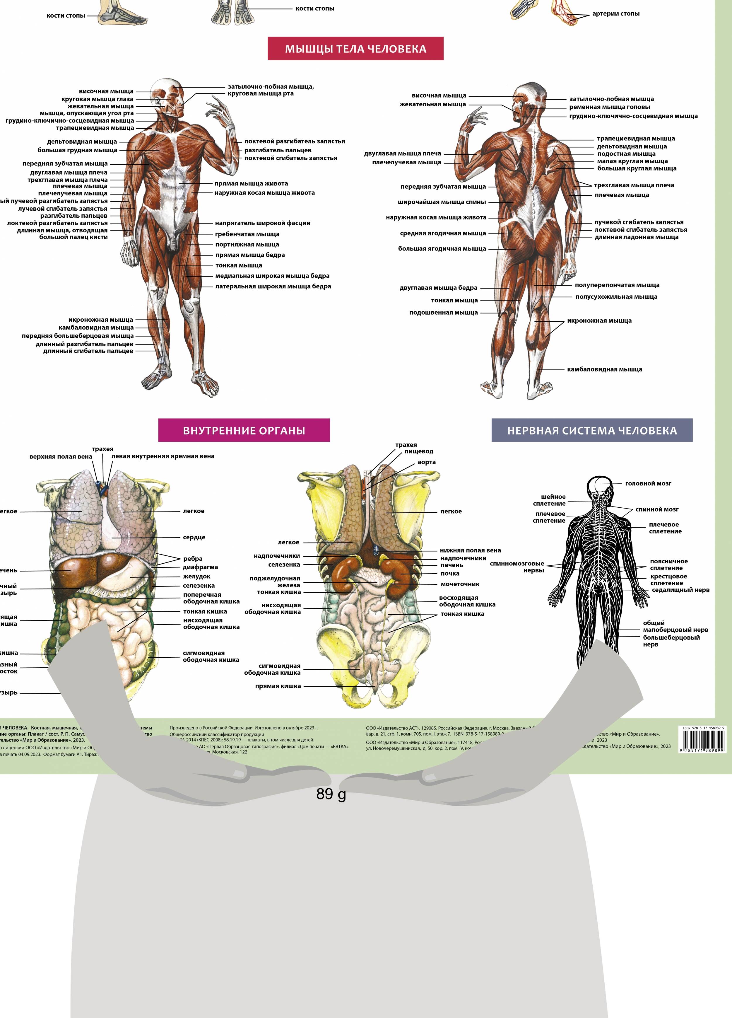 На плакате представлена полная анатомия человека: костная, мышечная, кровеносная, нервная системы и внутренние органы. Подойдёт для широкого круга читателей: школьников, студентов высших учебных заведений, художников и т.д. Простая терминология, понятные обозначения. От автора известных учебных пособий и атласов анатомии Р.П. Самусева.| Издательство | ИЗДАТЕЛЬСТВО "АСТ" |