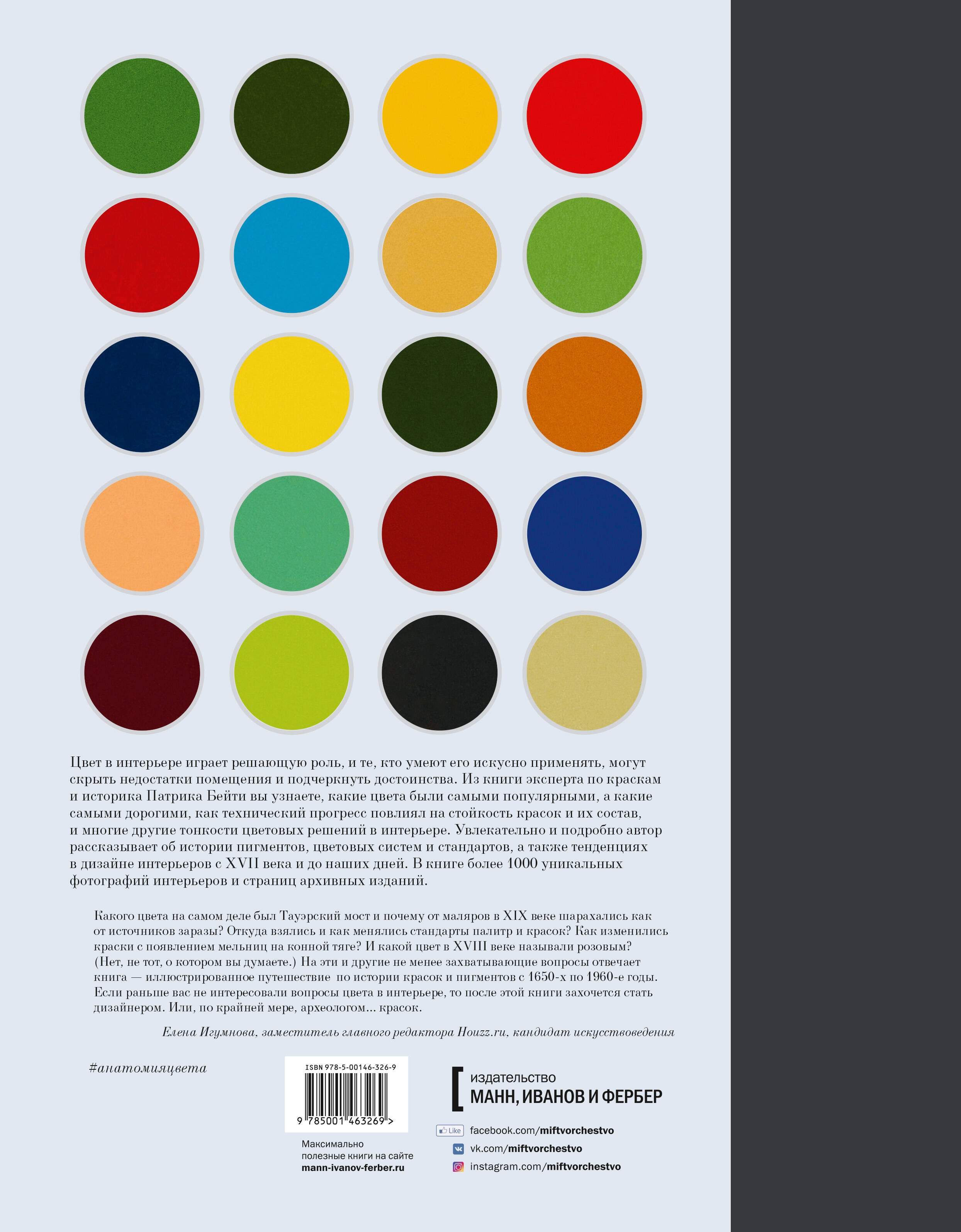 Эксперт по краскам и историк Патрик Бейти расскажет об истории пигментов, цветовых систем и стандартов, а также тенденциях в дизайне интерьеров с XVII века и до наших дней. Книга адресована всем, кто интересуется историей дизайна и красок.| Издательство | Манн, Иванов и Фербер |