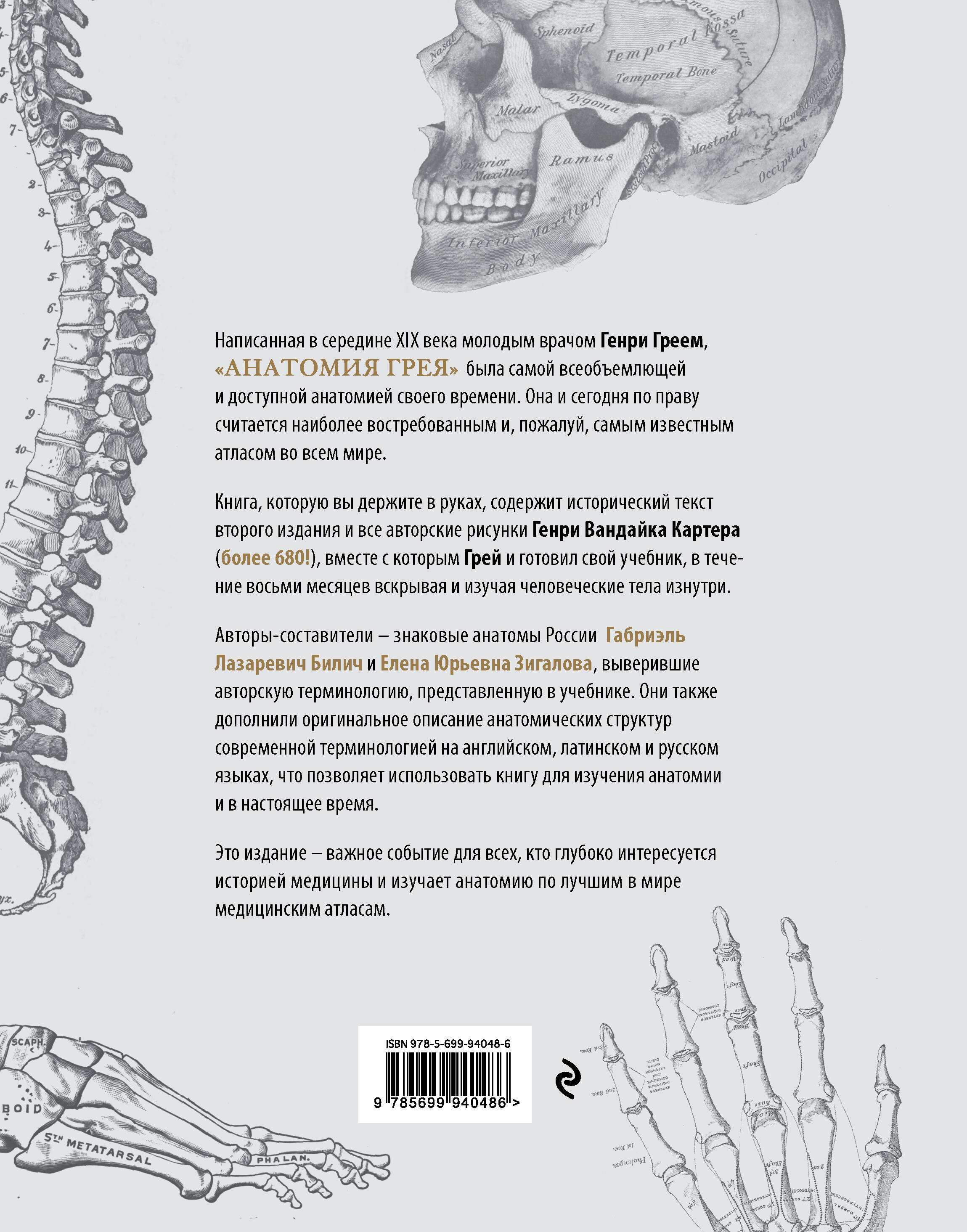 Написанная в 1850-х годах молодым врачом Генри Греем, "Анатомия Грея" была самой всеобъемлющей и доступной анатомией своего времени. Книга, которую вы держите в руках, содержит исторический текст второго издания и все авторские рисунки Генри Вандайка Картера (более 680!), вместе с которым Грей и готовил свой учебник, в течение 8 месяцев вскрывая и изучая человеческие тела. Уникальность этого издания в том, что авторы-составители использовали латинскую, английскую и русскую номенклатуры, что позволяет использовать книгу не только как талантливый раритет, но и изучать строение тела человека. Подарочное издание по анатомии в твердом переплете с оригинальными рисунками из Анатомии Грея - это: - 686 винтажных иллюстраций. - Красивое оформление и качественная бумага. - Авторы текста - известные российские медики и физиологи Билич Габриэль Лазаревич и Зигалова Елена Юрьевна.