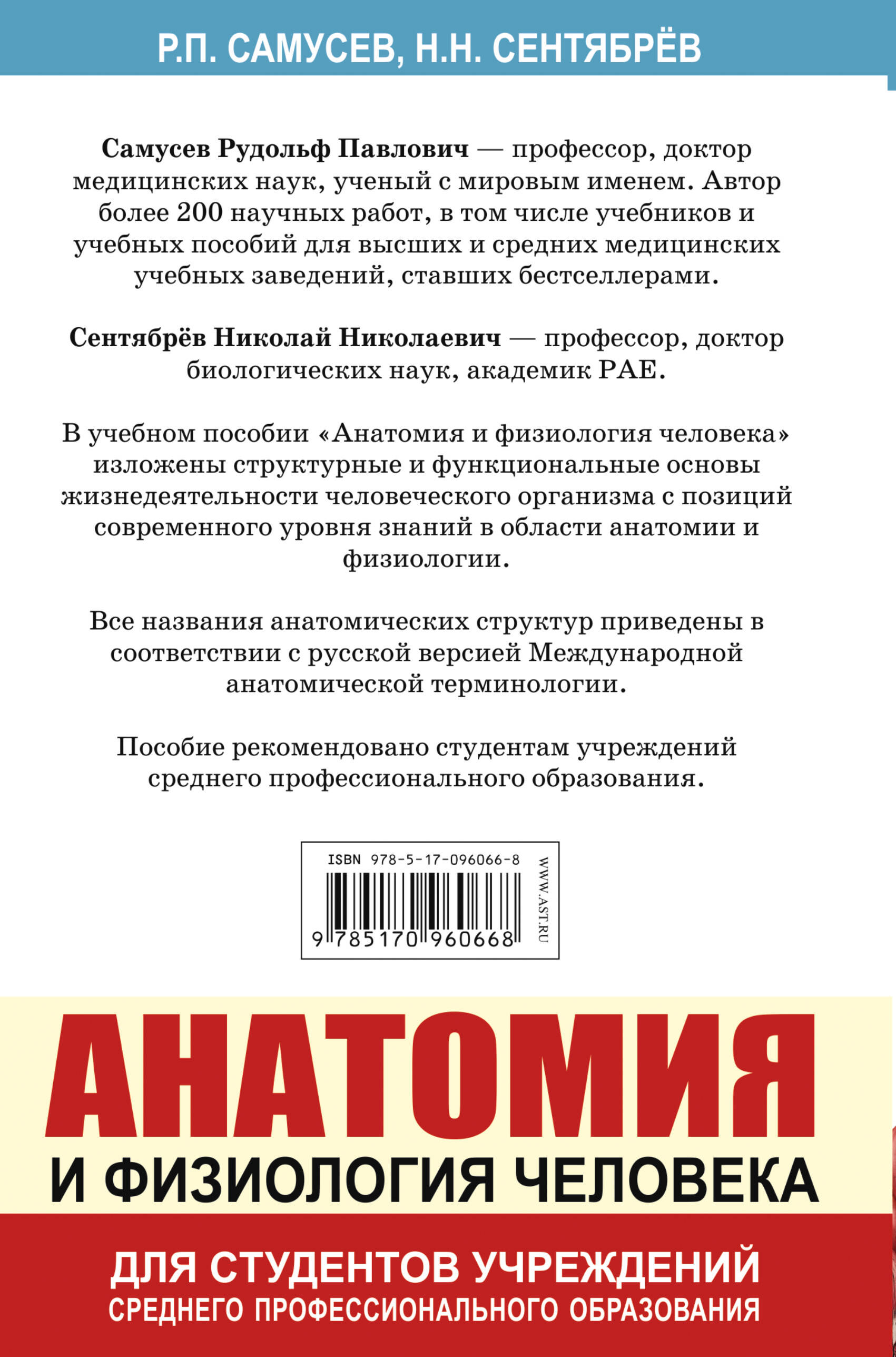 В учебном пособии в краткой форме изложены структурные и функ- циональные основы жизнедеятельности человеческого организма с пози- ций современного уровня знаний в области анатомии и физиологии. Усилена методологическая, профилактическая и практическая значи- мость сведений применительно к задачам практической медицины. Вся анатомическая терминология приведена в соответствии с Международной анатомической терминологией. Текст богато иллюстрирован большим количеством рисунков. Пособие рекомендовано студентам учреждений среднего профессио- нального образования, обучающимся по специальностям 060101.52 "Лечебное дело", 060102.51 и 060102.52 "Акушерское дело", 060501.51 "Сестринское дело".| Издательство | ИЗДАТЕЛЬСТВО "АСТ" |