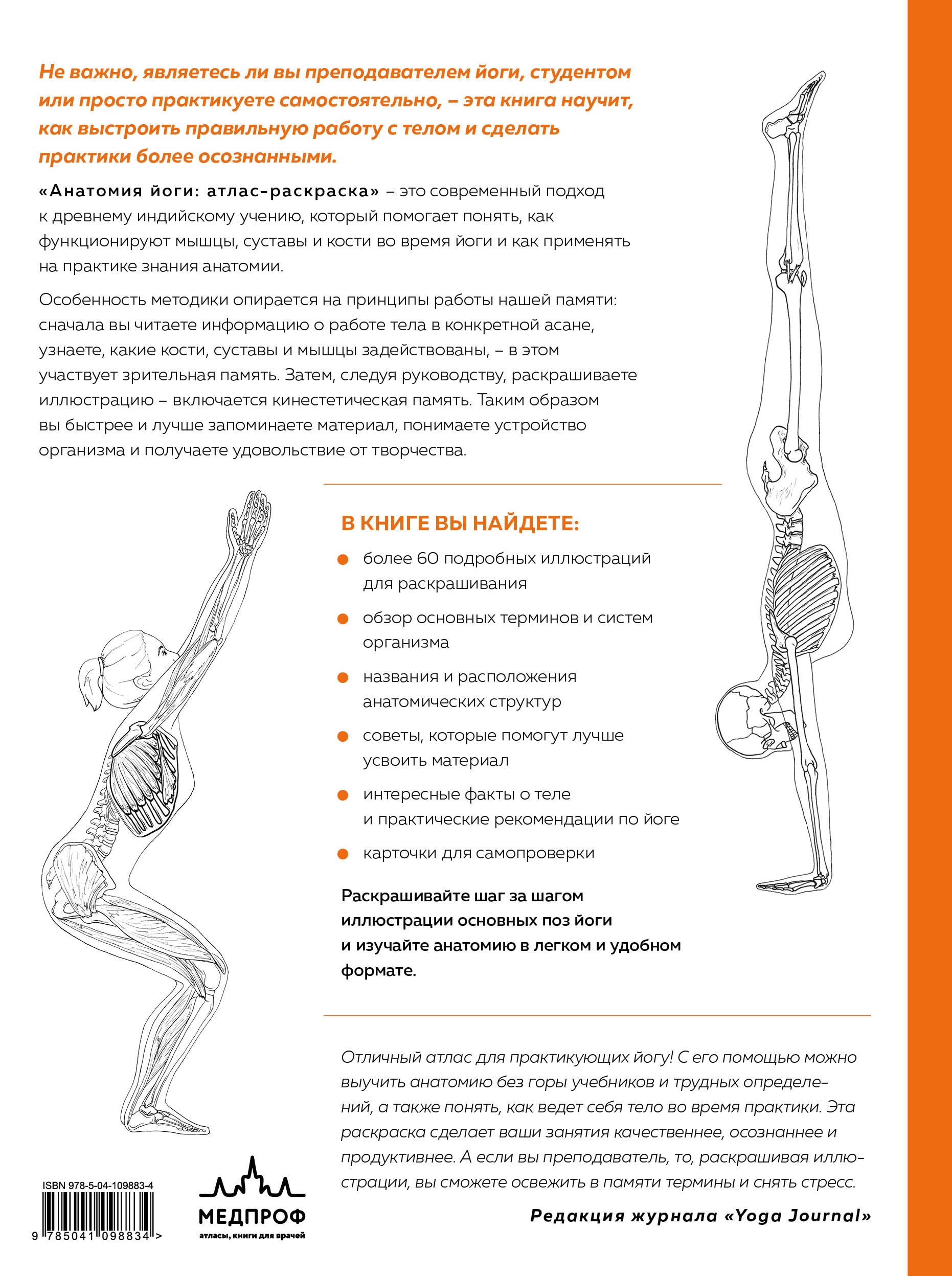 Разберитесь, как работает тело во время практики йоги, с помощью атласа-раскраски, и приступайте к практике. Вы узнаете: - основные понятия и термины; - любопытные факты о теле; - устройство костной системы и суставов; - принципы работы мышц в разных позах йоги; - особенности соединительной ткани организма. Шаг за шагом вы разберете каждую асану, выучите строение тела и раскрасите определенную структуру. Анатомия может быть не только нужной, но и очень увлекательной. Советы по раскрашиванию помогут лучше усвоить материал.