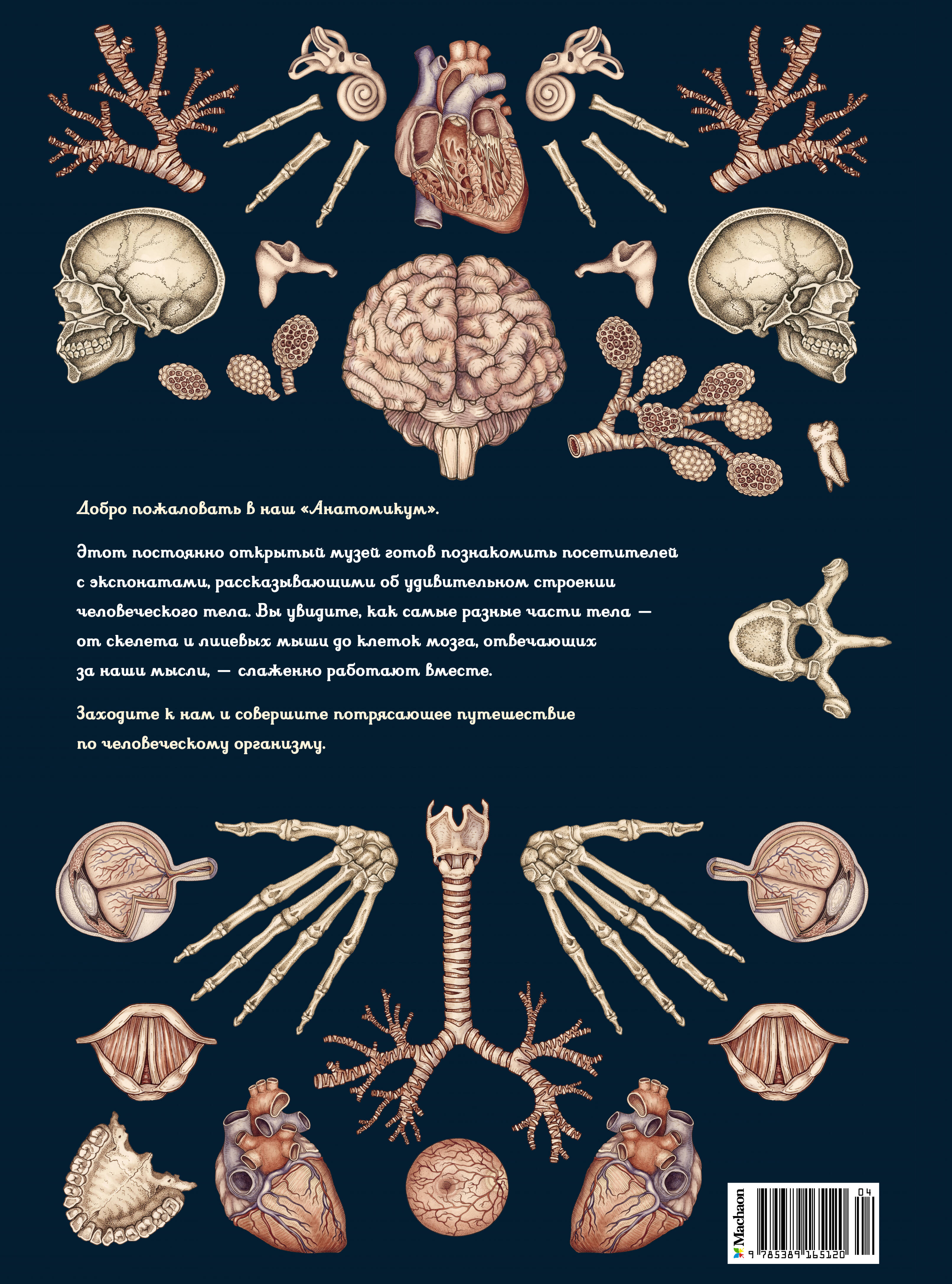 Добро пожаловать в наш "Анатомикум". Этот постоянно открытый музей готов познакомить посетителей с экспонатами, рассказывающими об удивительном строении человеческого тела. Вы увидите, как самые разные части тела - от скелета и лицевых мышц до клеток мозга, отвечающих за наши мысли, - слаженно работают вместе. Заходите к нам и совершите потрясающее путешествие по человеческому организму.| Издательство | Азбука-Аттикус Издат.группа ООО |