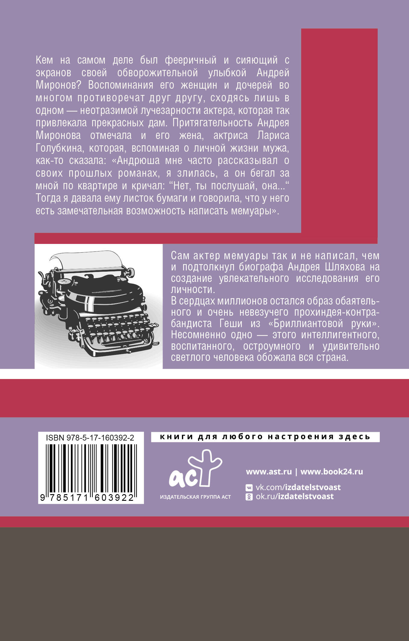 Кем на самом деле был фееричный и сияющий с экранов своей обворожительной улыбкой Андрей Миронов? Воспоминания его женщин и дочерей во многом противоречат друг другу, сходясь лишь в одном - неотразимой лучезарности актера, которая так привлекала прекрасных дам. Притягательность Андрея Миронова отмечала и его жена, актриса Лариса Голубкина, которая, вспоминания о личной жизни мужа, как-то сказала: "Андрюша мне часто рассказывал о своих прошлых романах, я злилась, а он бегал за мной по квартире и кричал: "Нет, ты послушай, она..." Тогда я давала ему листок бумаги и говорила, что у него есть замечательная возможность написать мемуары". Сам актер мемуары так и не написал, чем и подтолкнул биографа Андрея Шляхова, на создание увлекательного исследования его личности. В сердцах миллионов остался образ обаятельного и очень невезучего прохиндея-контрабандиста Геши из "Бриллиантовой руки". Несомненно одно - этого интеллигентного, воспитанного, остроумного и удивительно светлого человека обожала вся страна.