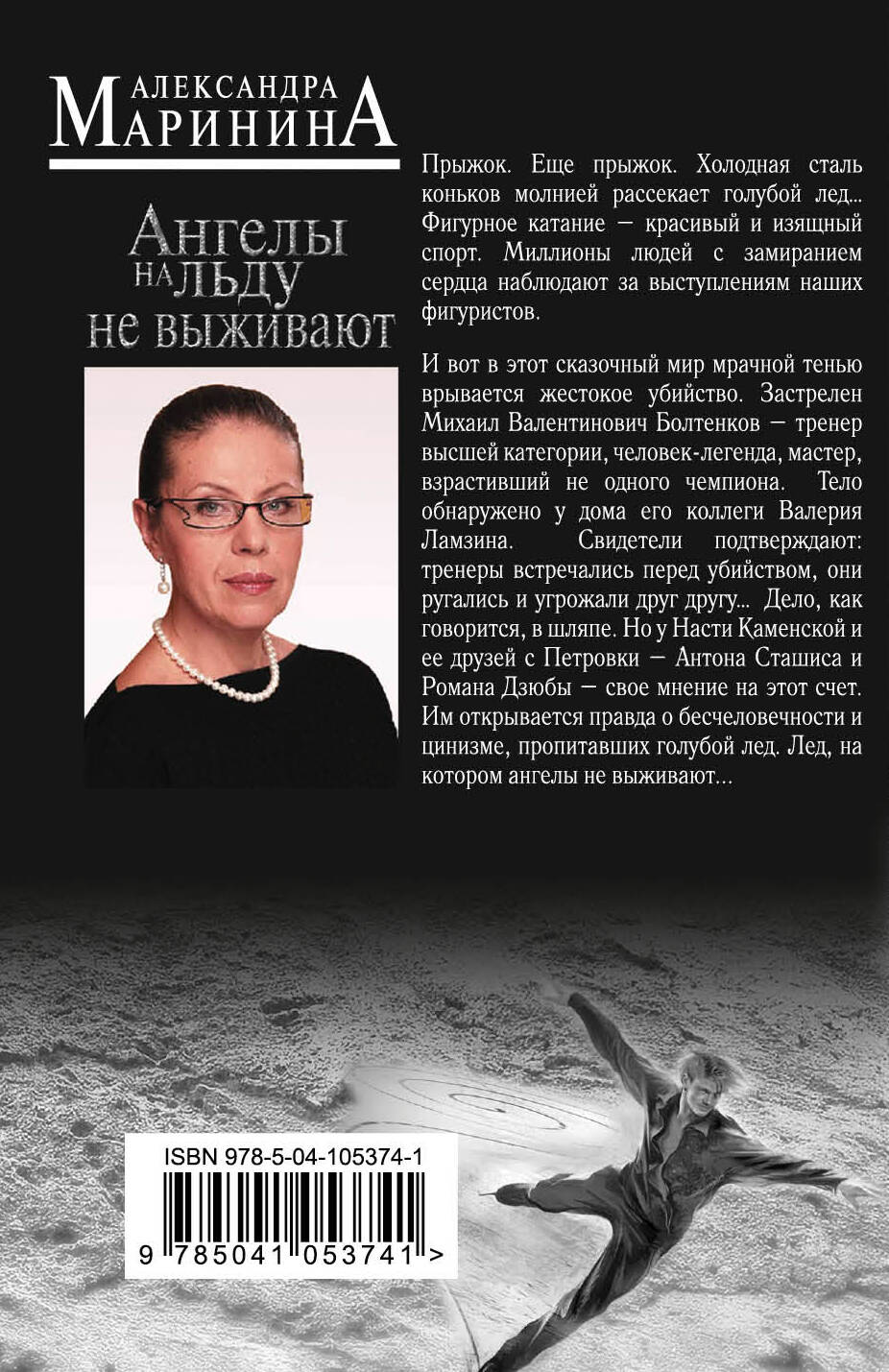 Прыжок. Еще прыжок. Холодная сталь коньков молнией рассекает голубой лед… Фигурное катание - красивый и изящный спорт. Миллионы людей с замиранием сердца внимают выступлениям наших фигуристов. И вот в этот сказочный мир мрачной тенью врывается жестокое убийство. Застрелен Михаил Валентинович Болтенков - тренер высшей категории, человек-легенда, мастер, взрастивший не одного чемпиона. Тело обнаружено у дома его коллеги Валерия Ламзина. Свидетели подтверждают: тренеры встречались перед убийством, они ругались и угрожали друг другу… Дело, как говорится, «в шляпе». Но у Насти Каменской и ее друзей с Петровки - Антона Сташиса и Романа Дзюбы - свое мнение на этот счет. Им открывается правда о бесчеловечности и цинизме, пропитавших голубой лед. Лед, на котором ангелы не выживают… «Маринина не только пишет детективные романы, но и отвечает на вечные вопросы. Автор относится к своим читателям как добрый и опытный учитель к ученикам, которые нуждаются в поддержке, подсказке и направлении на верный путь. Оптимистичная и практичная в своей дидактике, Маринина ставит перед собой вопрос "как жить" и старается помочь читателю найти свой путь к лучшей жизни в сегодняшнем мире. Своими детективами Маринина пишет современный роман "воспитания чувств": основная цель автора - воспитание посредством развлечения». - Анатолий Вишевский, Гринелльский колледж, США «Многие романы Александры Марининой в России экранизированы, а в Германии переработаны в радиопьесы. Исходя из того, что цель этих обработок - захватывать зрителей и слушателей таким же образом, как захвачены читатели, то фильм и радиопьеса являются не только дополнительными художественными произведениями, но и интересными интерпретациями, которые проникли в тайну успеха Александры Марининой». - Сара Хэги, Кельнский университет, Германия «В диалогах художественной и тривиальной литературы можно обнаружить разные способы стилизации "устности", чтобы достичь впечатления спонтанного разговора. Обиходная речь в романах А. Марининой отличается необыкновенно высокой степенью оживленности, что выражается, между прочим, в разных формах обращения собеседников, в различных оттенках вежливости и в эмоциональности используемой лексики». - Вольфганг Штадлер, Университет имени Леопольда Францена, Инсбрук, Австрия| Издательство | ООО "Издательство "Эксмо" |