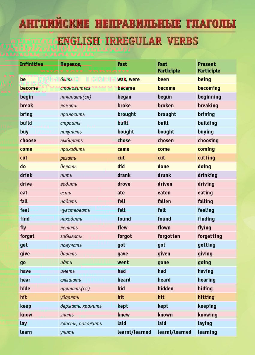 Перед вами яркая многоцветная таблица "Английские неправильные глаголы".