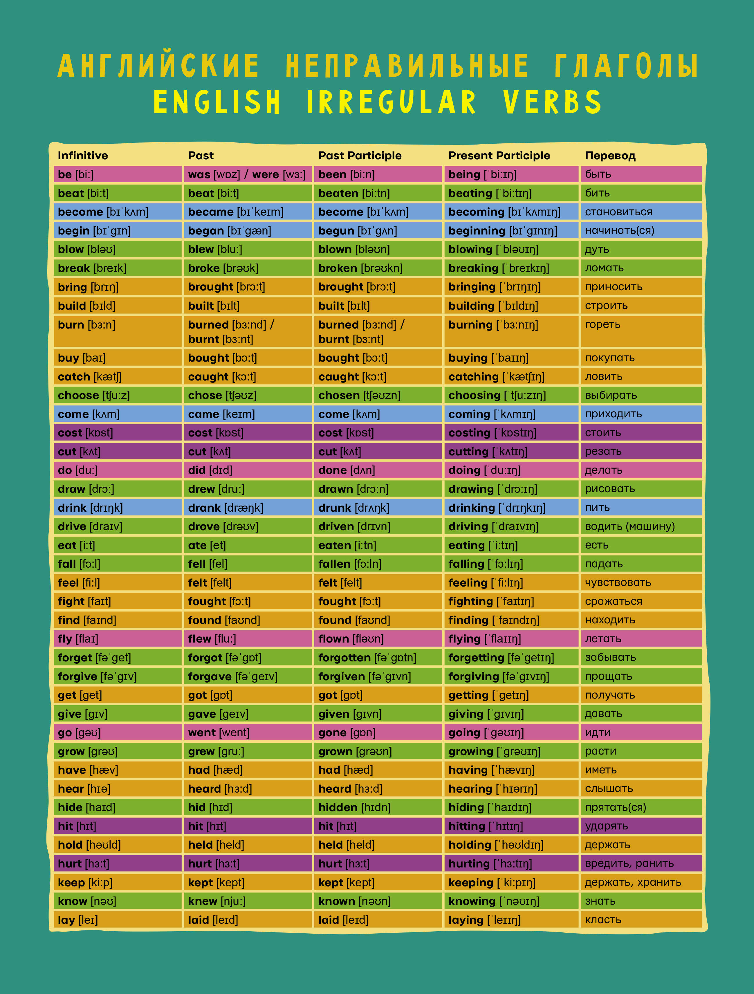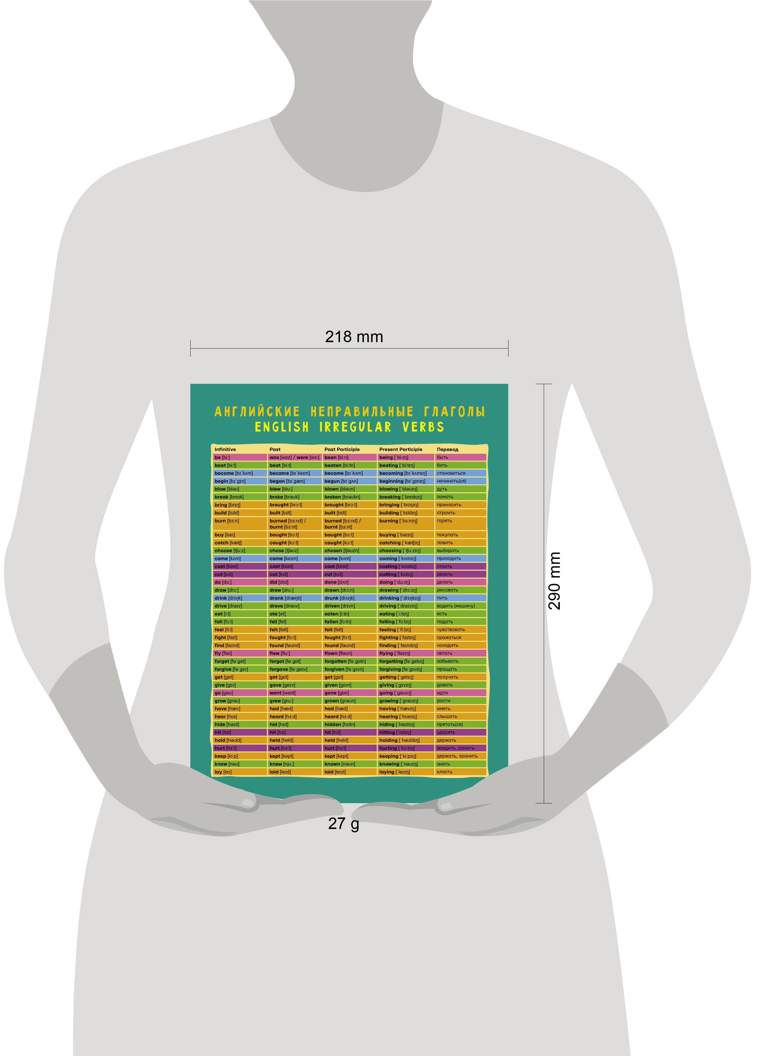 Плакат-подсказка "Английские неправильные глаголы" - незаменимый помощник в изучении английского языка. В таблице представлены 80 самых употребительных неправильных глаголов. К каждому глаголу даются три формы, а также ing-форма и перевод. Все формы глаголов снабжены международной фонетической транскрипцией. Глаголы с похожим способом образования форм выделены одинаковыми цветами. Плакат предназначен для всех, кто изучает или преподает английский язык.| Издательство | ИЗДАТЕЛЬСТВО "АСТ" |